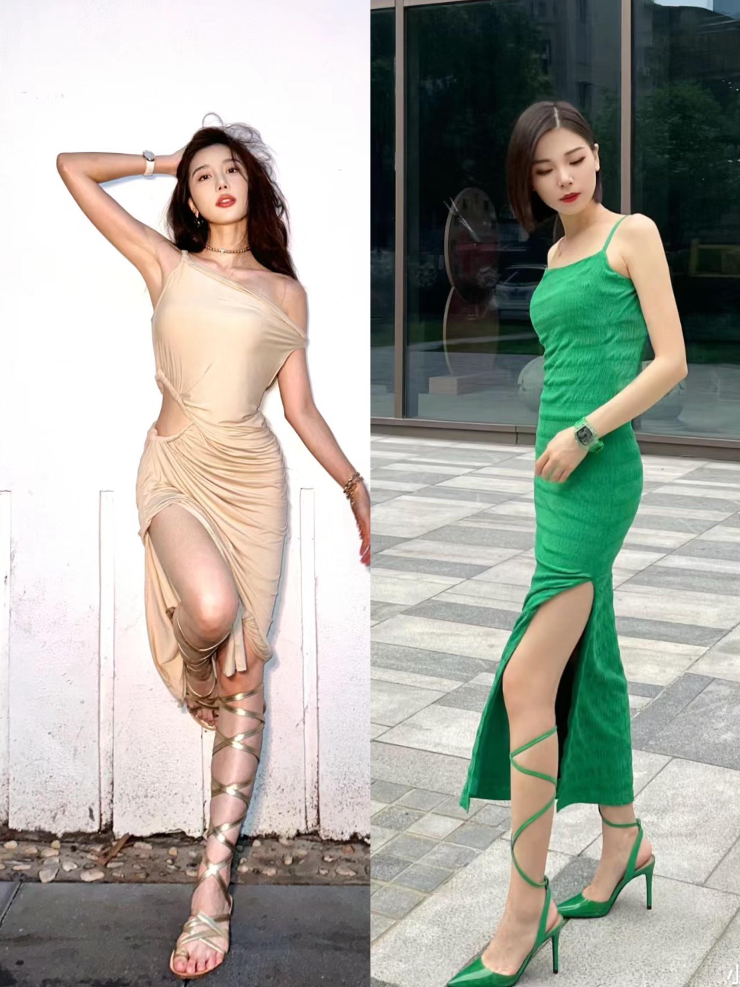 細綁帶的涼鞋,可以更好的修飾腳部線條。不規則的綁帶、反而更加顯瘦。輕便的綁帶涼鞋,配修身的連衣裙,溫柔優雅。