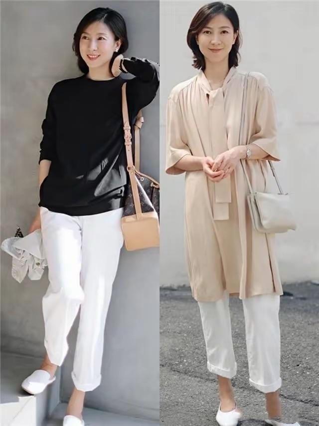 搭白色九分褲,剛好露出腳踝,清爽洋氣還顯高。同時白色九分褲捲起褲筒,配同色系的淺口穆勒鞋,實現視覺上的延伸,輕盈顯高。
