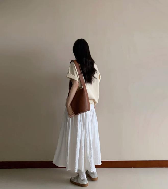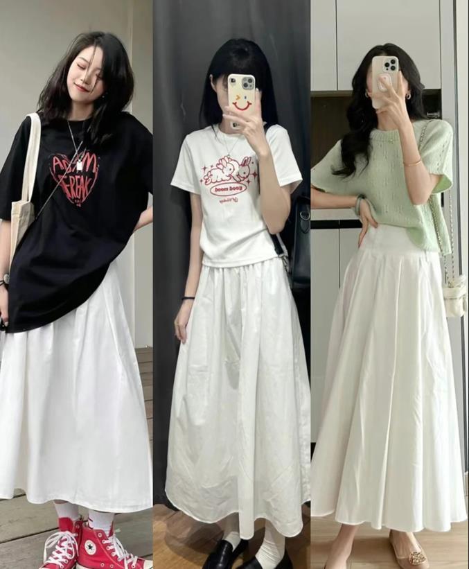夏天就是很流行穿裙子啊,當你不知道選擇什麼裙子來穿的時候,就給自己入手一條白色半裙吧,長款的半身裙,不僅可以遮掩起腿部的缺點,還能讓你展現出溫柔與氣質。上衣簡單配一件t恤就可以,不管是寬鬆版型,還是修身正肩的款式,只要根據自己身材來穿總歸沒錯的。