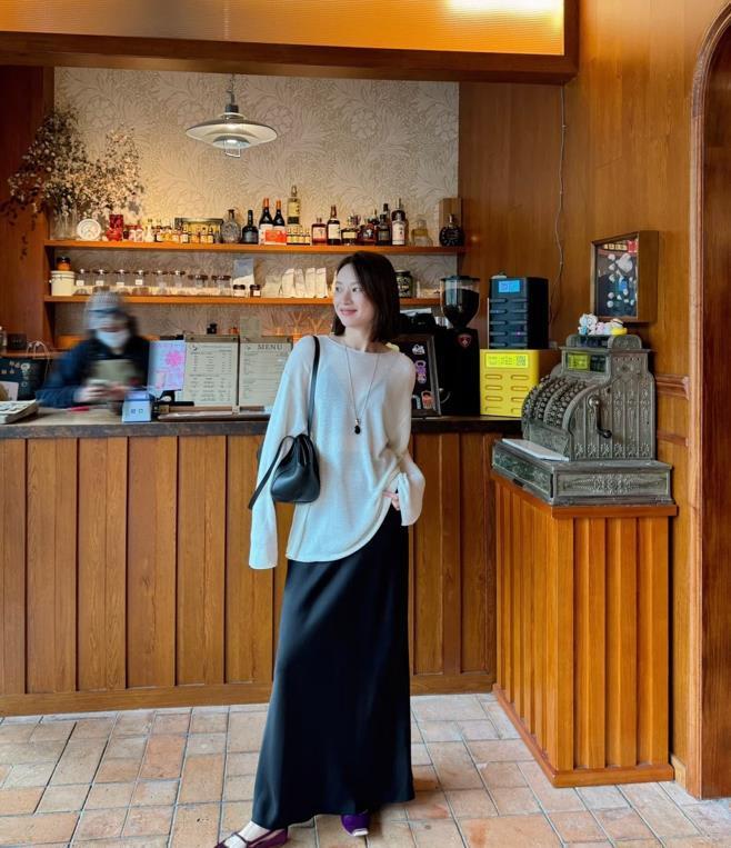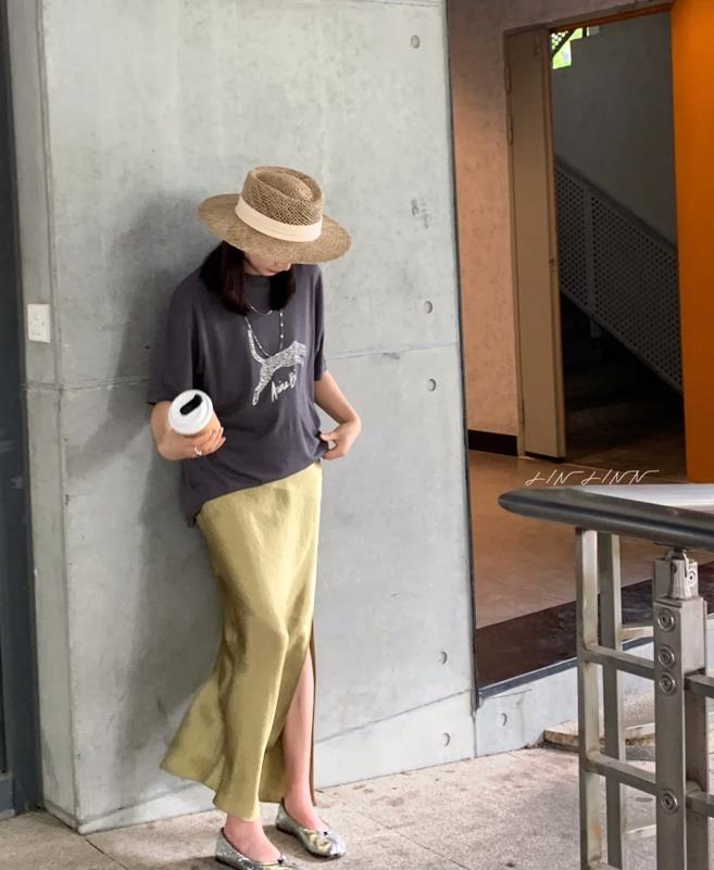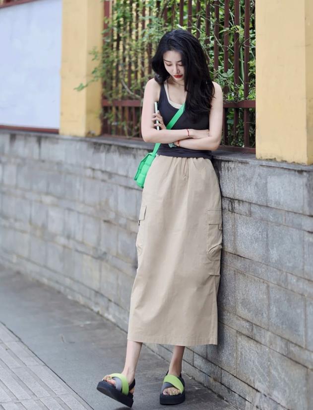 今年醋酸款式的半裙,又在時尚圈裏掀起了一陣熱潮,黑色的醋酸半身長裙,自帶高級感,這種光滑的面料,超級適合夏天的,很舒適又清涼。上衣可以配t恤,或者是襯衫,小背心之類的,一整套看起來非常有氣質。