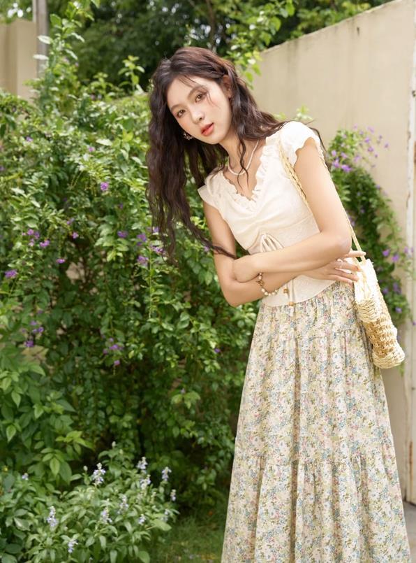 這一套法式小清新風的穿搭,看起來實在是太好看和溫柔了,短款的上衣,專屬於小個子女生的,特別是骨架小的女生,穿起來就很顯瘦。與碎花半身長裙相配,顯瘦和修飾身材一絕的。