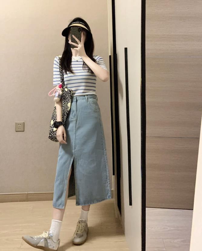 牛仔半裙可是非常經典百搭和耐看的一種裙子了,不管是在什麼時候,它的利用率都不會太低,開叉設計的款式,很好拉長了腿部線條,又隱約流露出小性感。選擇經典藍白條紋t恤相配,整體給人的感覺實在是太清爽了。