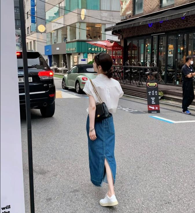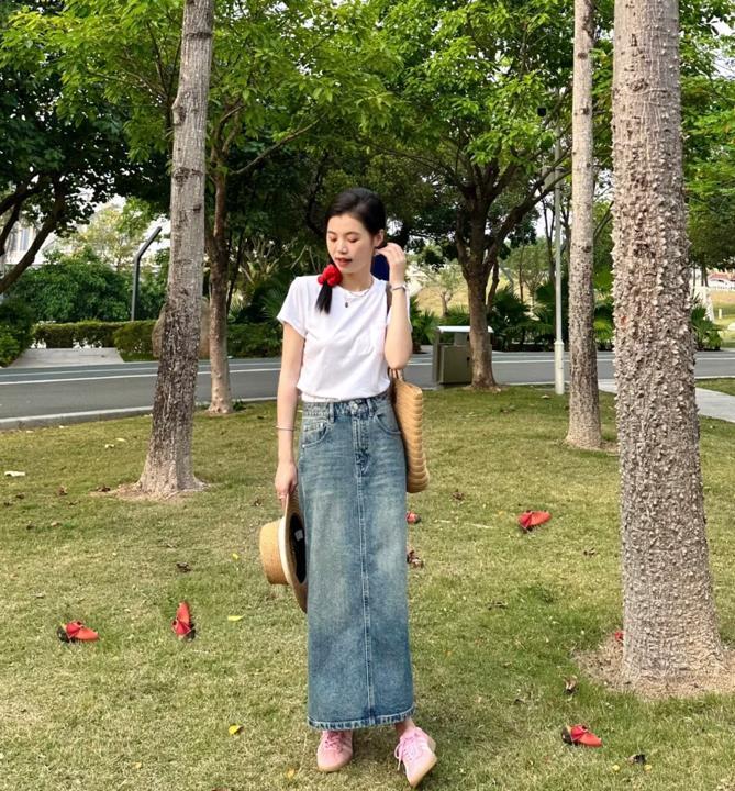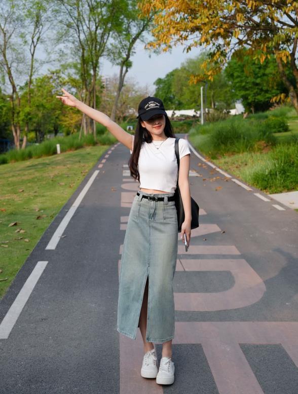 比起牛仔半身短裙,我更喜歡這種長款一點的裙子,一來是可以很好遮掩起腿粗的缺點,二來是能打造出優雅和氣質。穿牛仔半身裙的時候,簡單配一件白色t恤就很好看,夏季出門這樣穿,真的相當不錯呢。