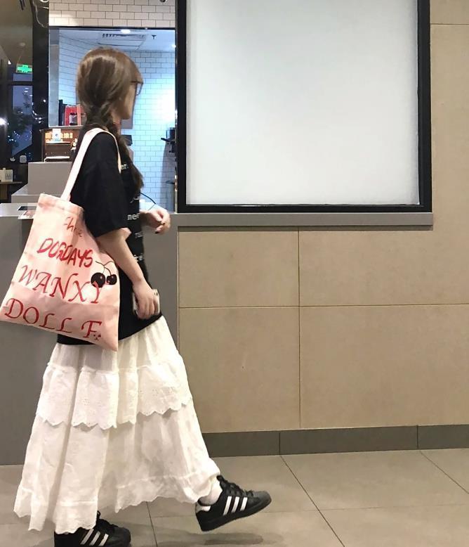 在夏天,白色的裙子也是非常受歡迎的,自帶仙氣感的白裙子,相信很多女生們都會喜歡的吧?這一條白色半身長裙,看起來真的非常漂亮呢,搭配黑色寬鬆t恤,鬆弛感的搭配,讓你感受到舒適自在,還很顯瘦。