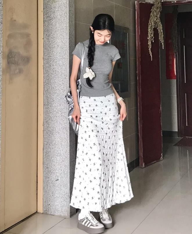 灰色正肩t恤,穿起來真的太修飾身材了,骨架小的女生可以穿,搭配白色碎花魚尾半身長裙,看起來就非常溫柔和氣質。上簡下繁的組合,不僅打造出層次感,還充滿了少女範氣息。