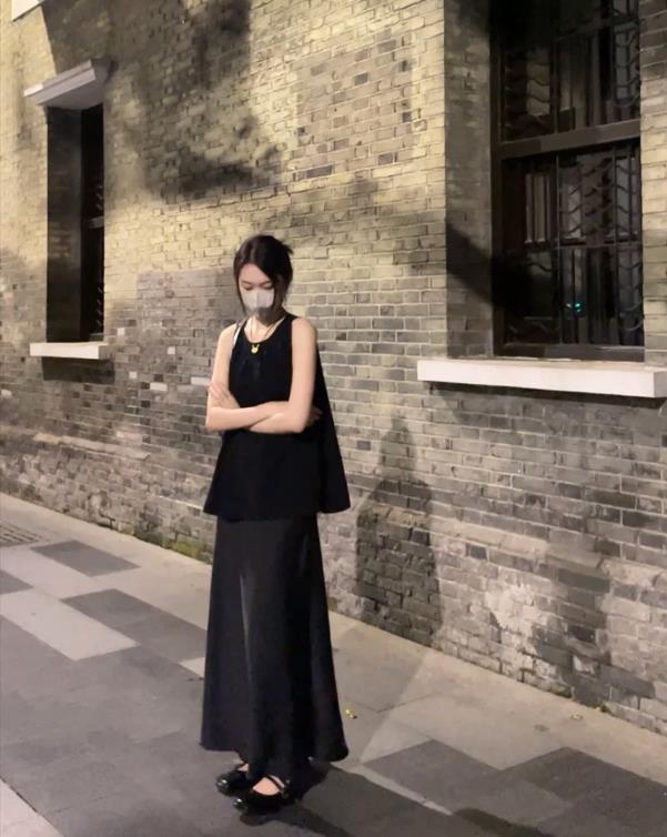 一身黑色系的打扮,看起來也太高級了,同色系的組合,最是省心和時髦了,而且黑色系的單品,在視覺上還能給人一種瘦身的效果。寬鬆的背心+寬鬆的半身長裙,這麼穿就是很顯瘦和隨性。