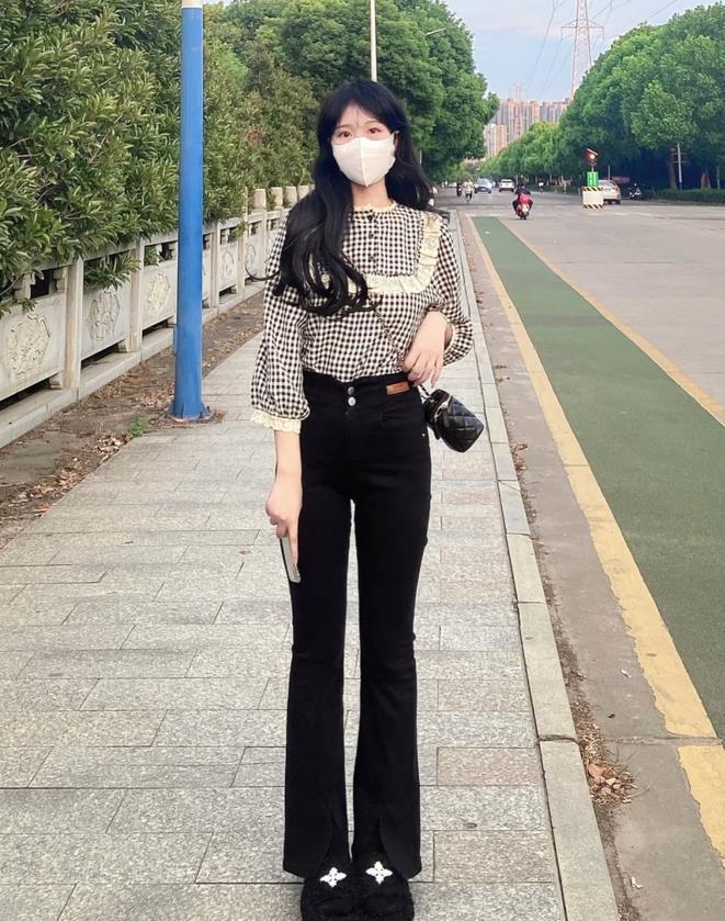 上短下長的搭配,實在是太適合小個子女生了,這麼穿真的太顯高挑和顯腿長了,蕾絲格子襯衫+黑色馬蹄褲,遵循了簡繁組合,不僅好看還非常溫柔氣質。