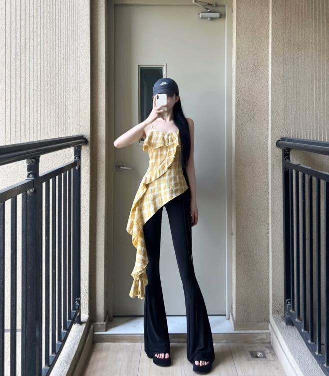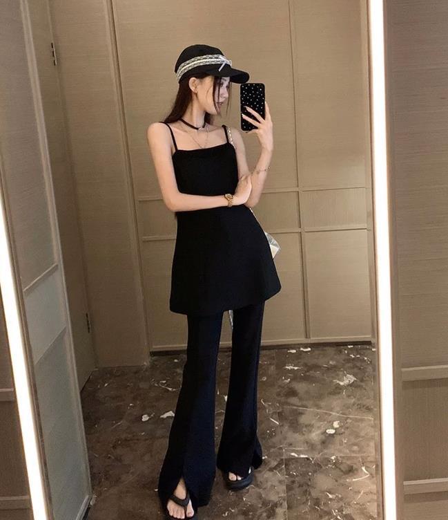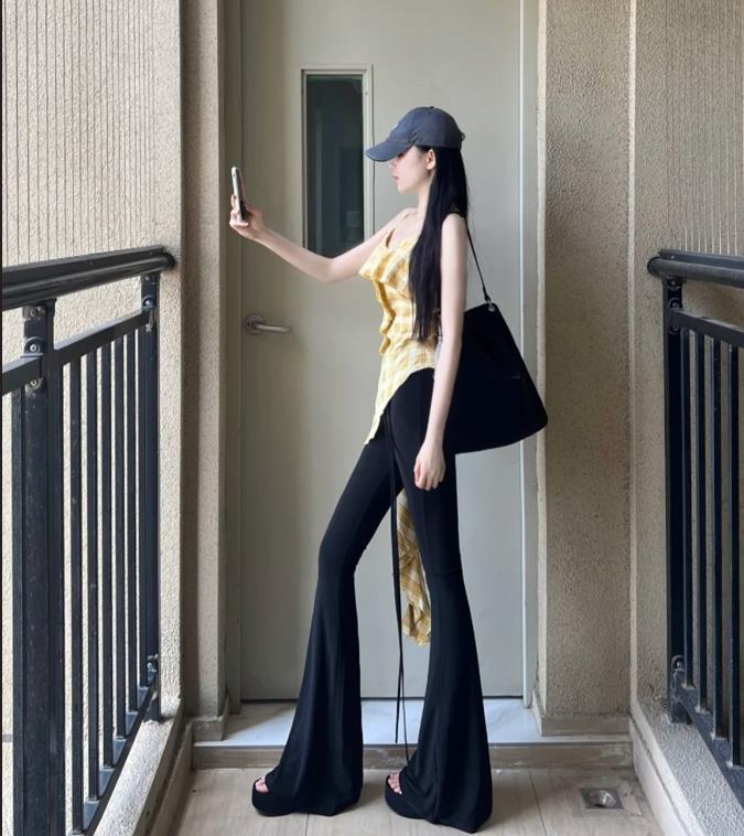這纔是夏天該有的樣子,不規則吊帶+黑色馬蹄褲,這麼顯個性和新潮的穿搭,追求個性穿搭的姐妹們說什麼也要試試看。黑色的馬蹄褲,穿起來實在是太顯瘦了,也能很好拉長腿部線條。