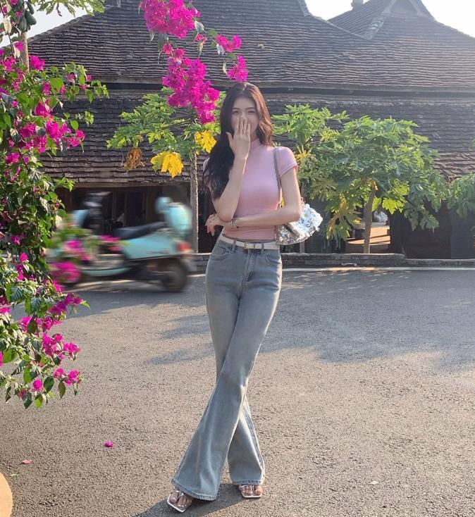 粉色t恤+牛仔馬蹄褲+高跟涼鞋,這樣的穿搭看起來也太顯氣質了吧,上短下長的搭配,優化了身材比例,還將下身的腿部線條拉長。腰間增加的細腰帶,既修飾了身材,又爲整個穿搭增加了細節感。