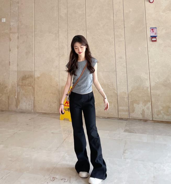 150小個子女生很適合的一套,上短下長的搭配方式,實在是太適合小個子女生了,短款t恤+黑色馬蹄褲,這麼一條褲子簡直是腿粗身材的摯愛,穿起來就顯瘦和顯腿長。