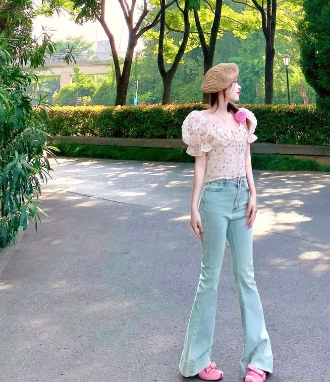 甜辣又清新的一套,很適合夏天呢,短款花上衣+牛仔馬蹄褲,上短下長的組合,真的太修飾身材了,關鍵是顯高挑和顯瘦。