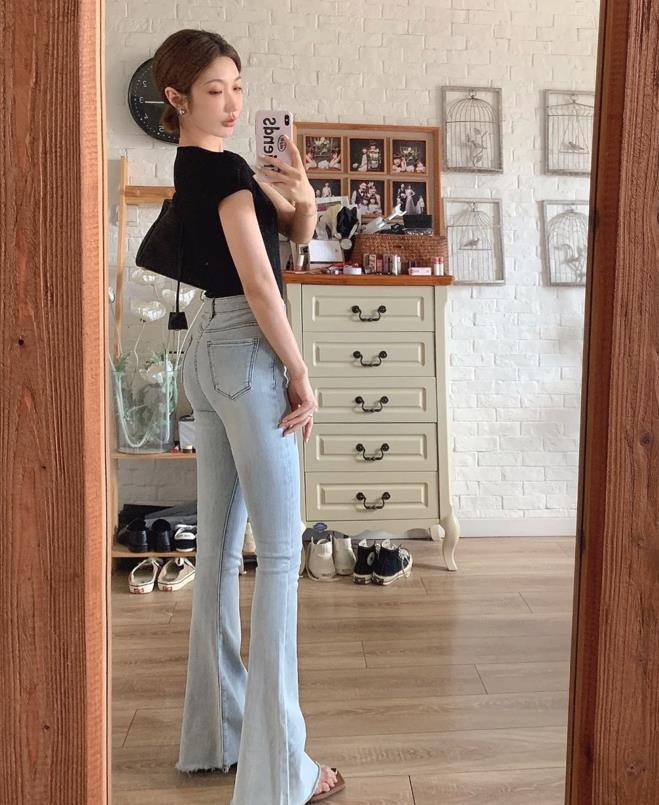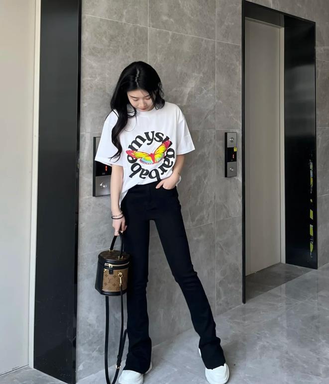黑色牛仔馬蹄褲,隨便怎麼搭配都不容易出錯,也很好看時髦,這種褲型在膝蓋往下的位置就是寬鬆的,可以有效遮掩住腿粗的缺點。搭配各種上衣,t恤、小背心或者是襯衫之類的,都是很不錯的選擇。