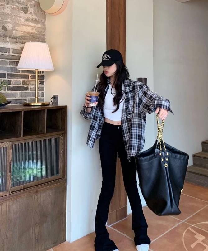 這一套冪式穿搭,真的太值得姐妹們借鑑了,黑色馬蹄褲,穿起來也太顯瘦和顯腿長了吧,最重要的是這個款式很百搭,也不挑人。選擇一件白色背心+格子襯衫來配,夏天出門逛街或者是度假輕鬆hold住。