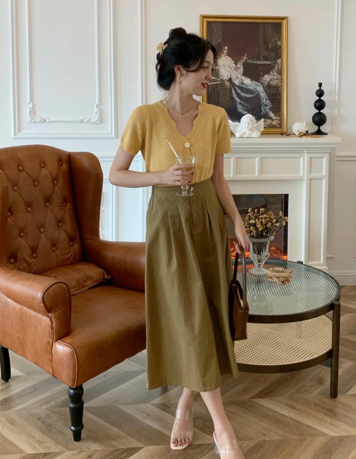 比如一件明黃色的T恤搭配卡其色的半身裙,簡單大方且不失時尚感。腳上穿上一雙白色涼鞋,整個造型洋溢着青春的活力。