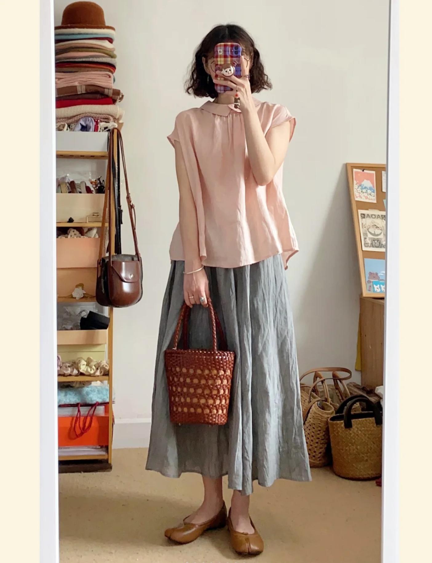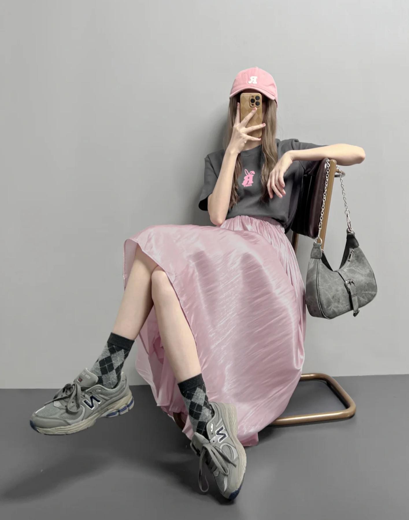 一件淺粉色的寬鬆上衣搭配灰色長裙,輕鬆營造出親和力十足的日常穿搭。腳上穿上一雙粉色或灰色的平底鞋,整體造型和諧又舒適。