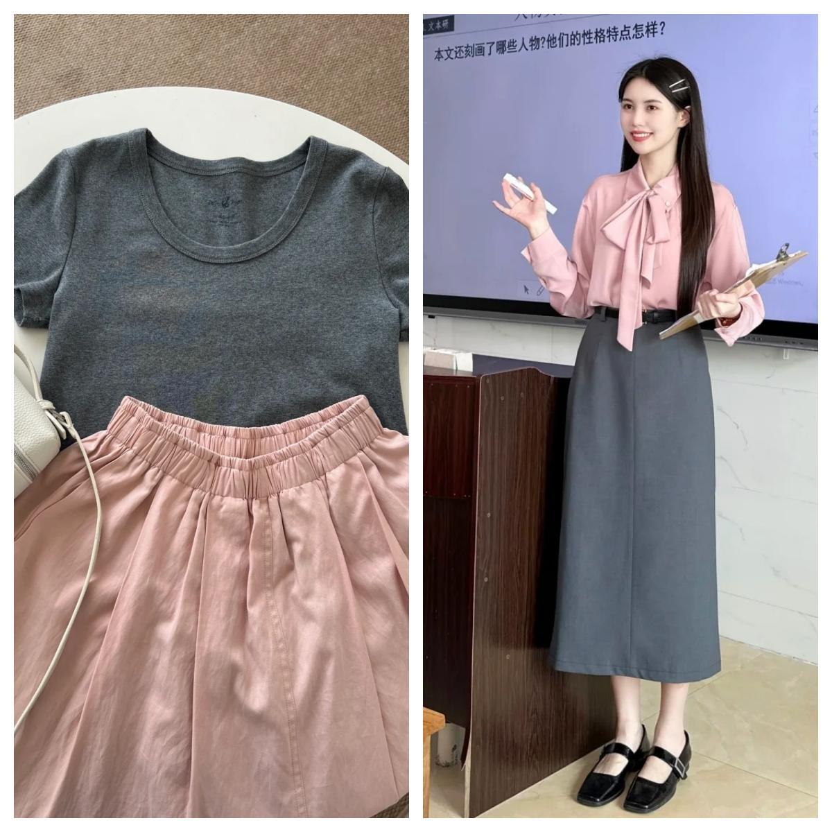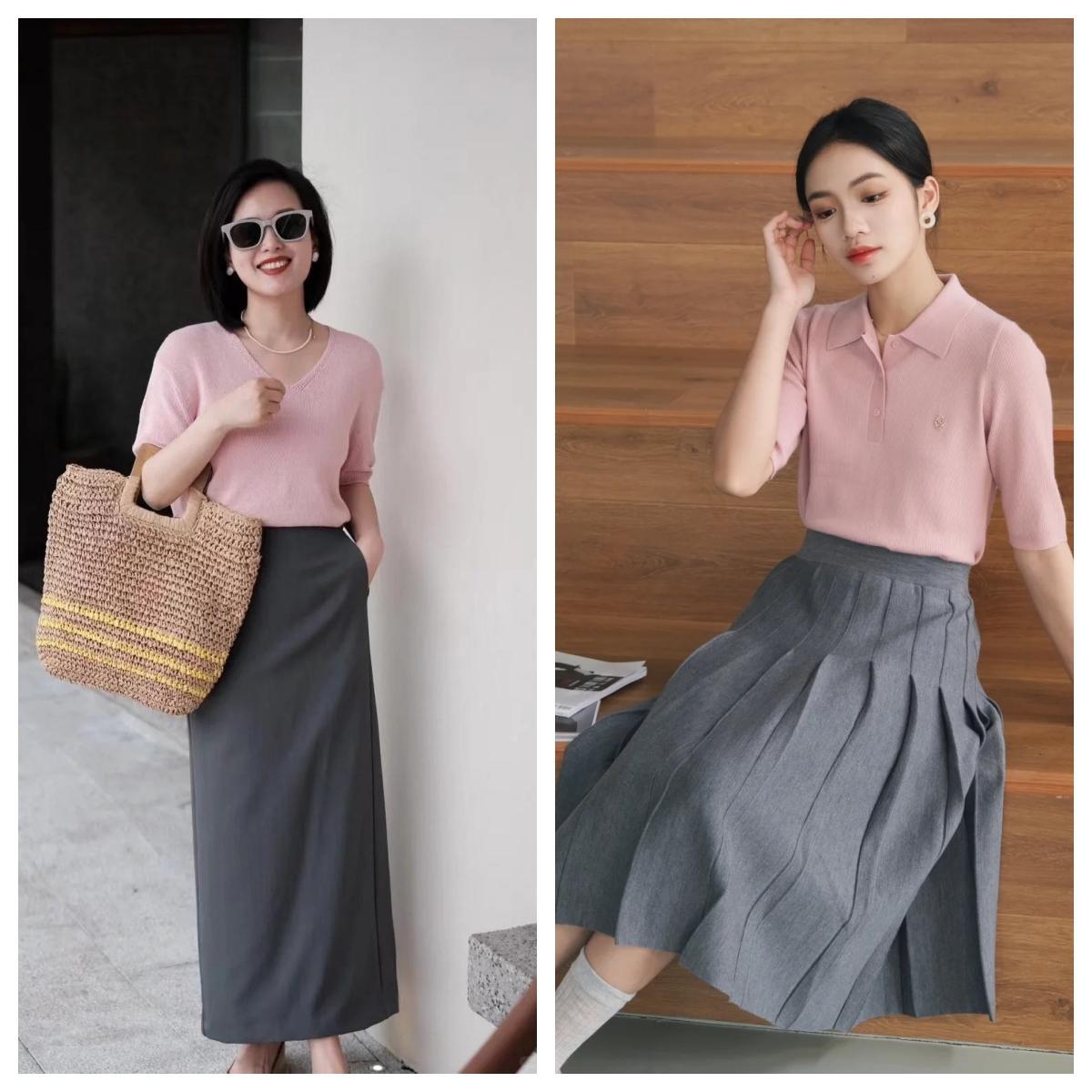 或者上衣是灰色,半身裙搭配流光的粉色,營造活力的年輕感。