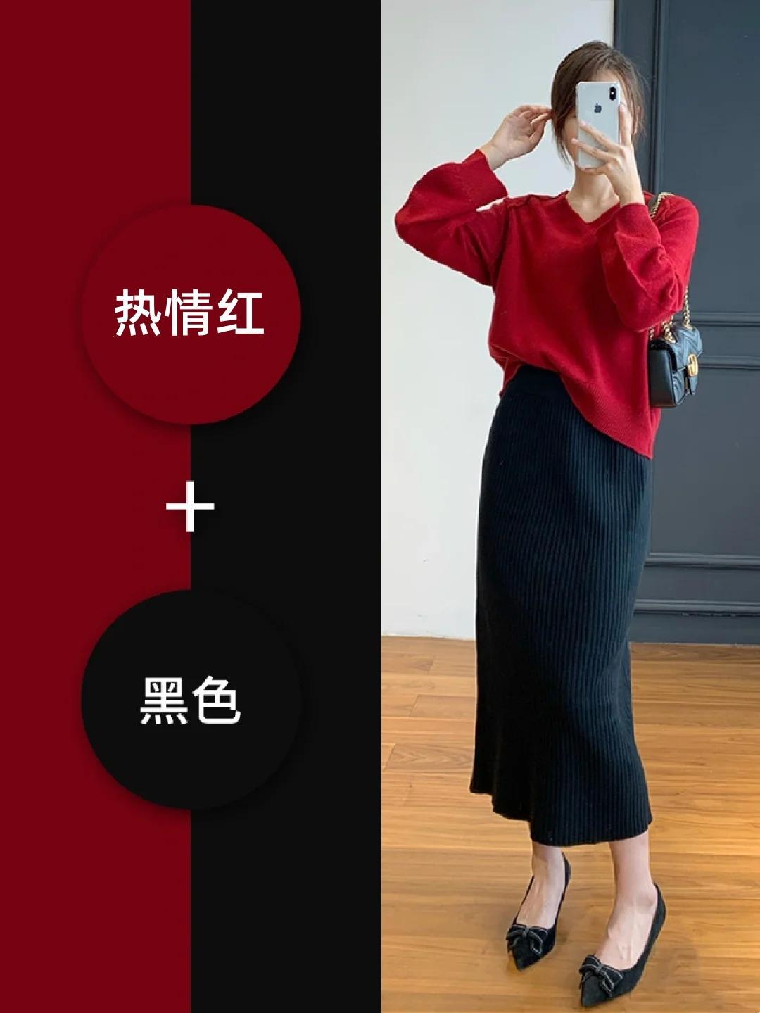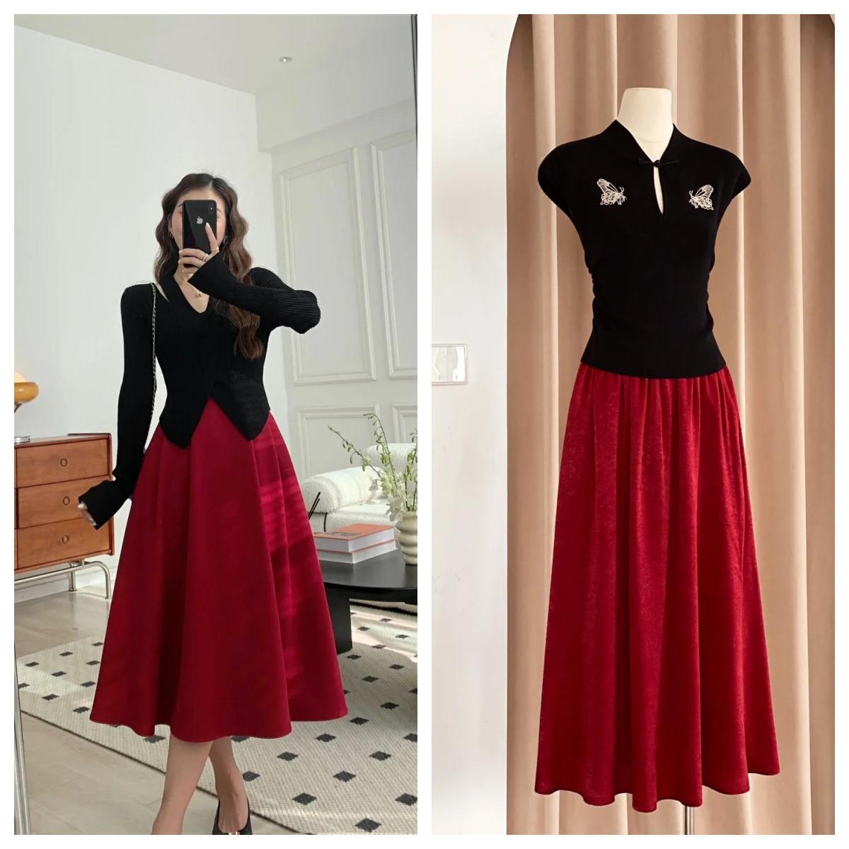 紅與黑集合的新中式真的是YYDS,紅色上衣搭配黑色馬面裙,或上黑下紅,國風滿滿,又不會顯得過於張揚。