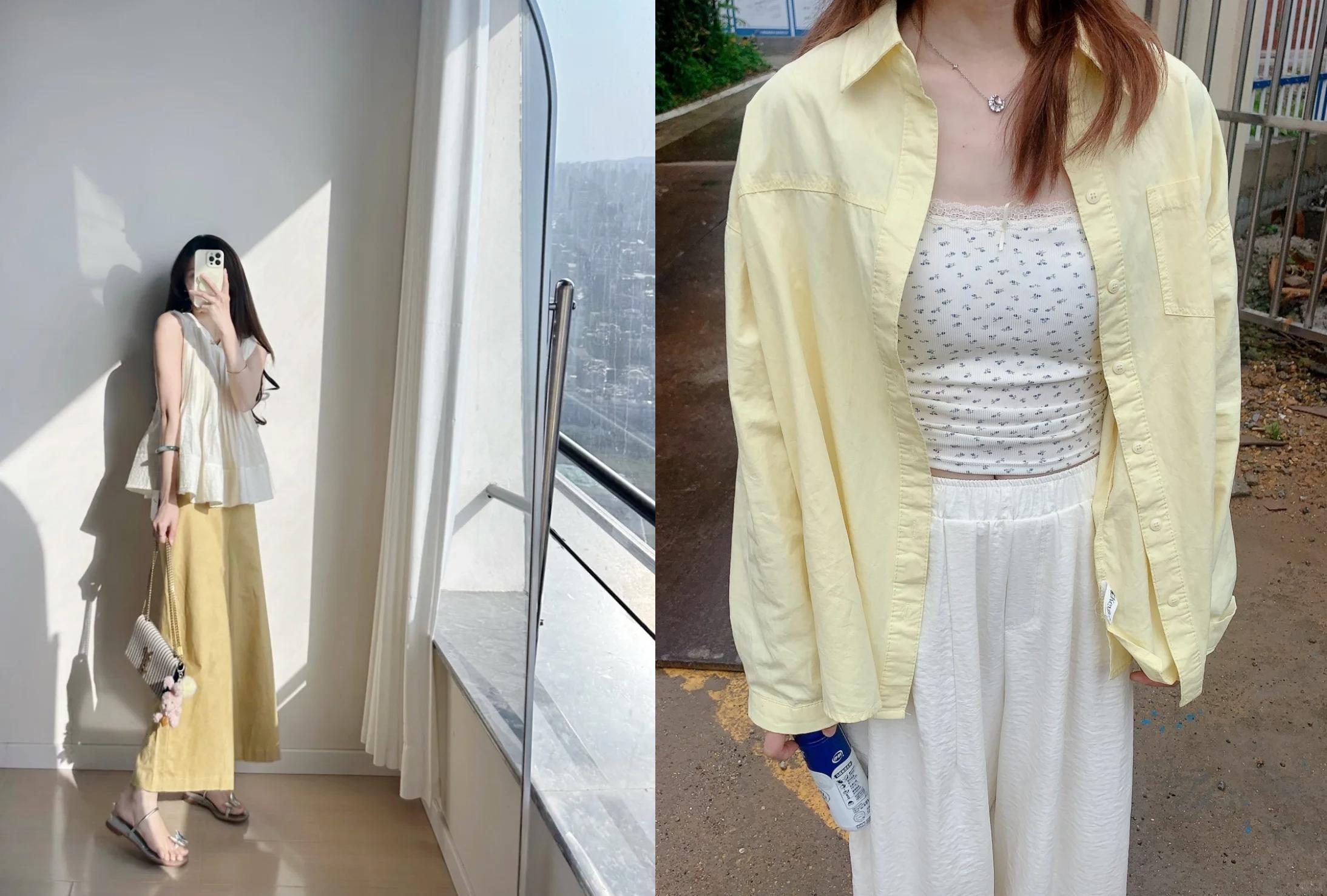 選擇一條奶油黃色的半身裙,搭配一件白色的露肩上衣或白色蕾絲上衣,展現出甜美的氣質。