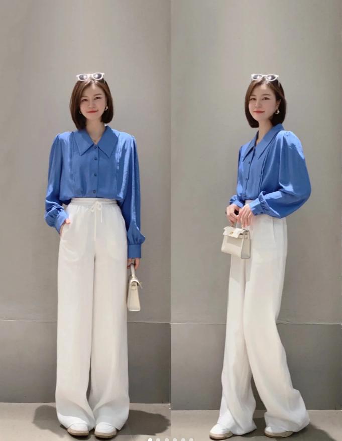 一件藍色的雪紡襯衫搭配白色直筒褲,簡約而不失格調。腳踩一雙米色高跟鞋,整體造型既清爽又充滿知性美。