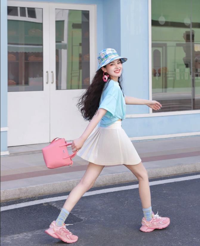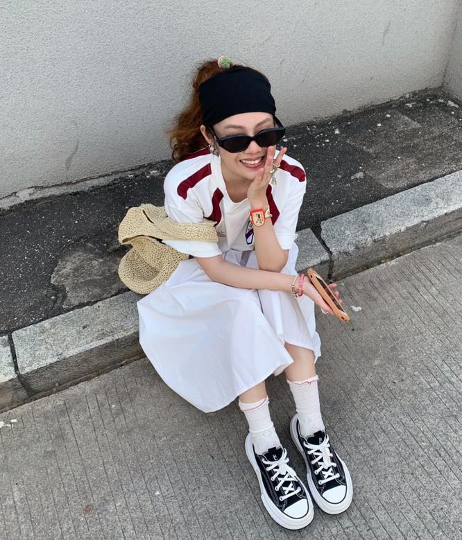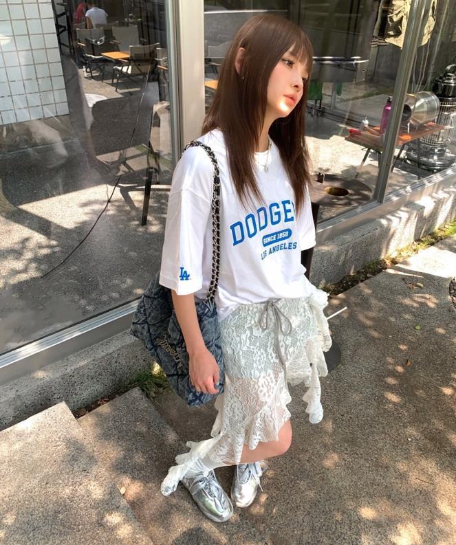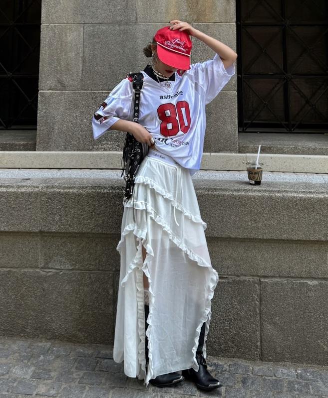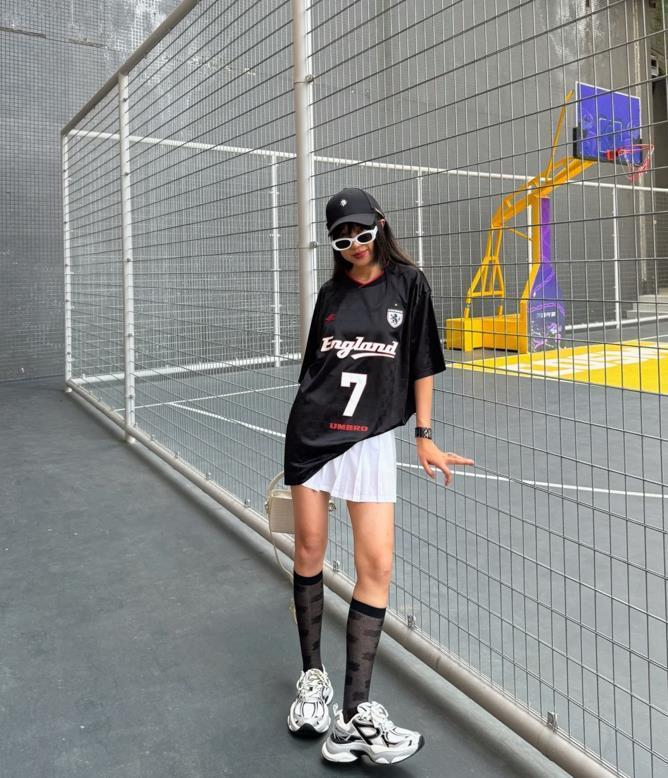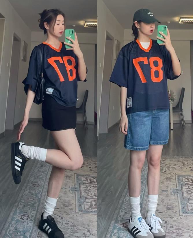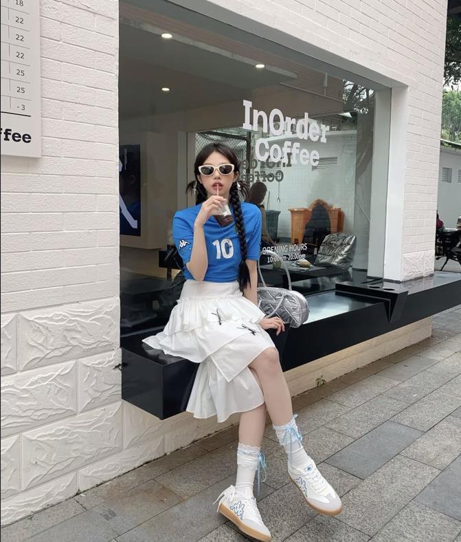 這個夏天,真的太流行運動混搭風了,喜歡休閒穿搭的姐妹一定要試試看,藍色球衣和白色蛋糕裙的碰撞,再加上一雙德訓鞋,既不失復古又帶着鬼馬少女感,這種反差的時髦感輕鬆就拿捏住了。