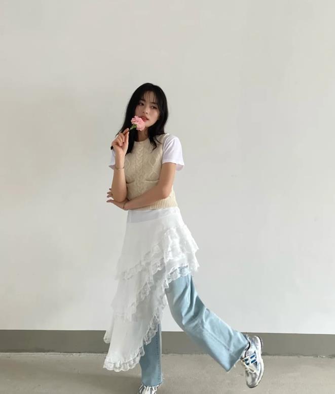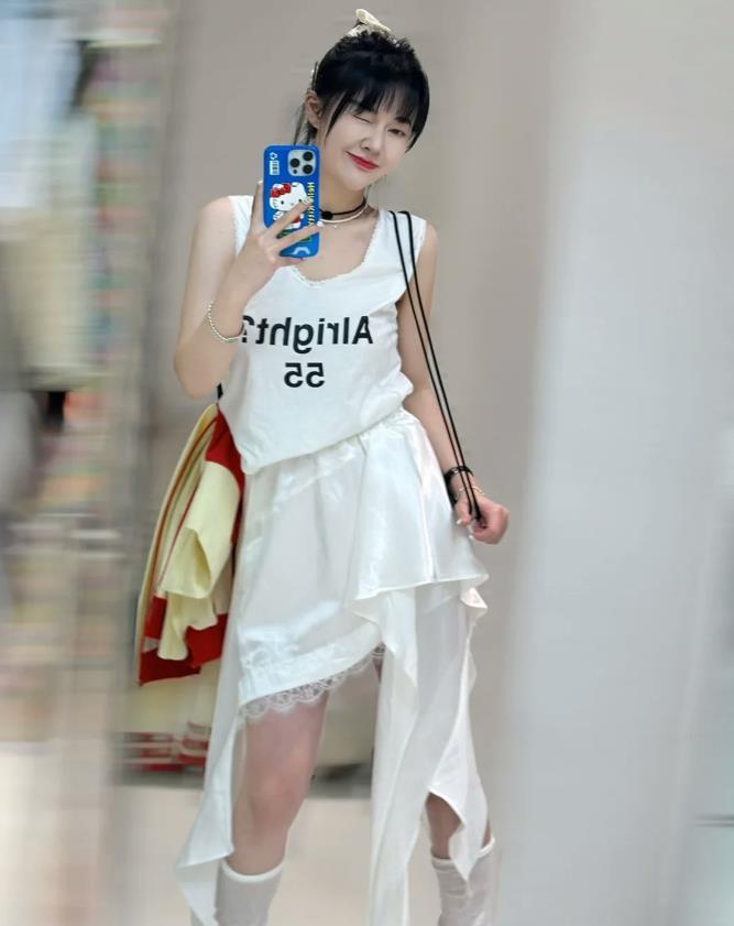 真的很喜歡這種運動風和個性風混合在一起的穿搭,有種剛柔並濟的既視感,白色運動背心+不規則半身長裙,很好展現出少女運動風,自由又不失隨性。