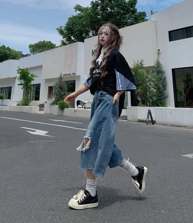 復古運動風又回潮了,這種休閒時髦兩不誤的穿搭,姐妹們真的不妨試試看,拼色的運動短袖,搭配六分長的牛仔闊腿褲,褲子還進行了破洞的設計,個性又潮流。記得要把腰線比例給提高起來,這樣纔不至於壓低你的個子。