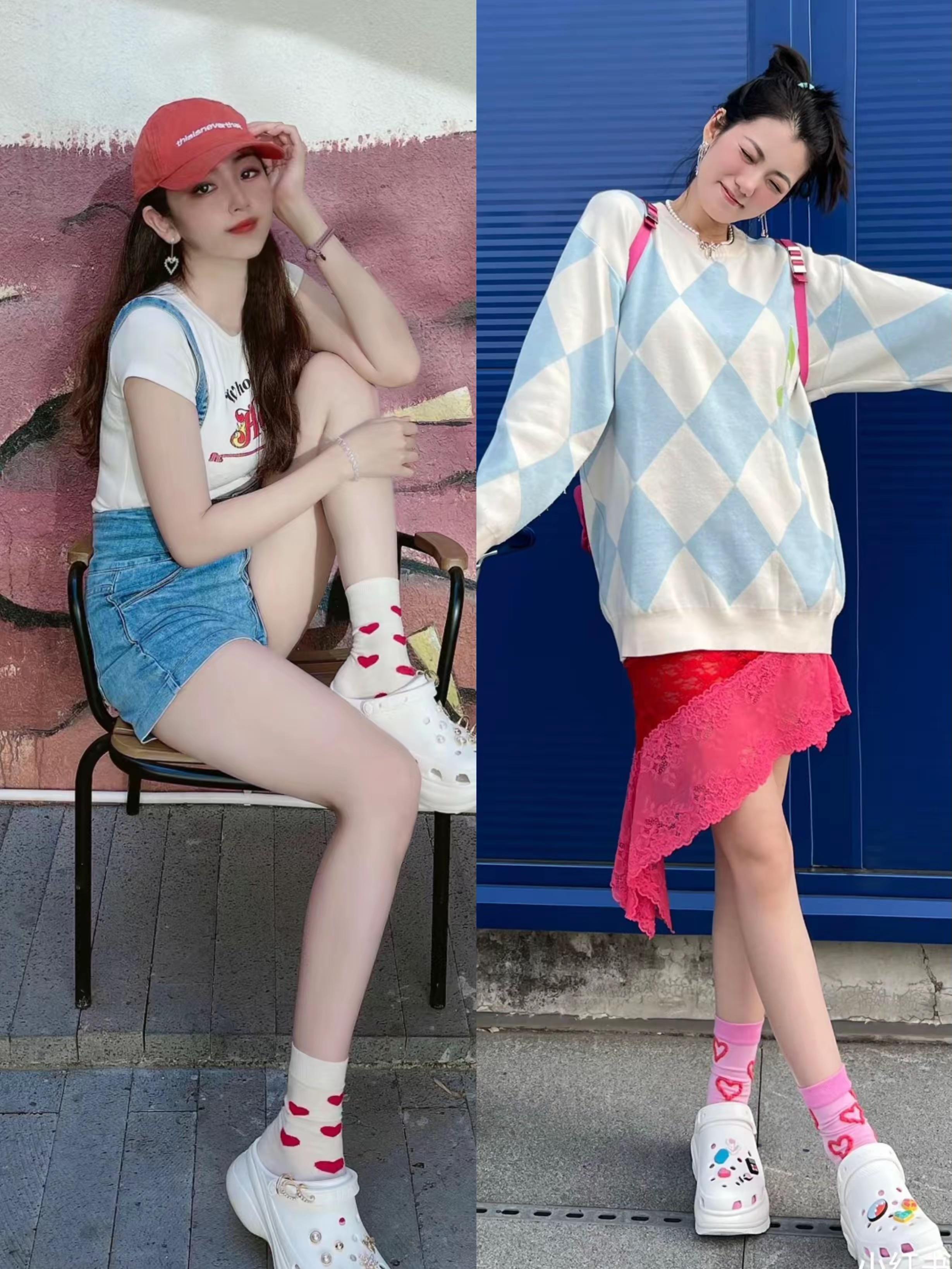 想要更具風格屬性,在穿着洞洞鞋的時候,還可以搭配一雙中筒襪,會更顯腿瘦。洞洞鞋配中筒襪,一定要注意襪子與服裝色彩或者配飾色彩呼應。