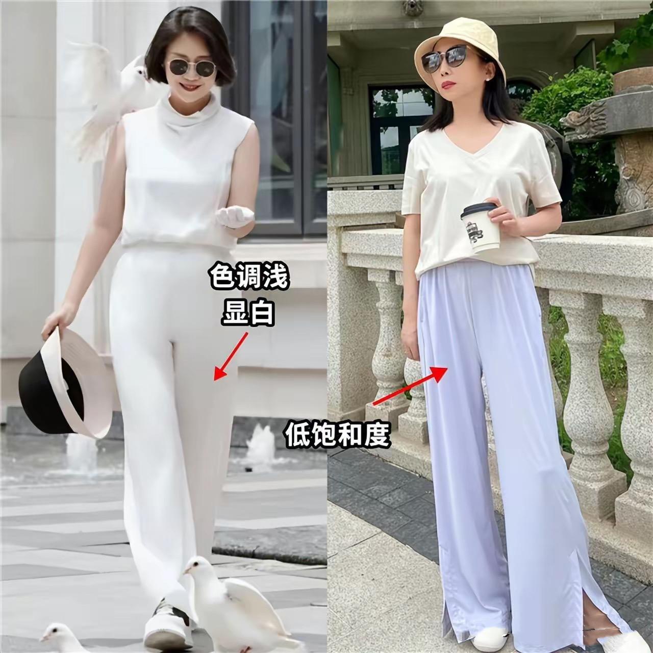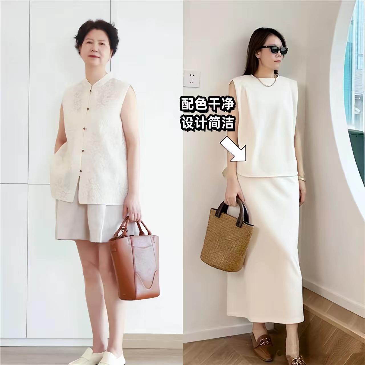 夏天裏的純白色,亮度太高。五六十歲的女人,擔心穿起來會顯黑。這時候不妨嘗試,柔和度更強的米白色。