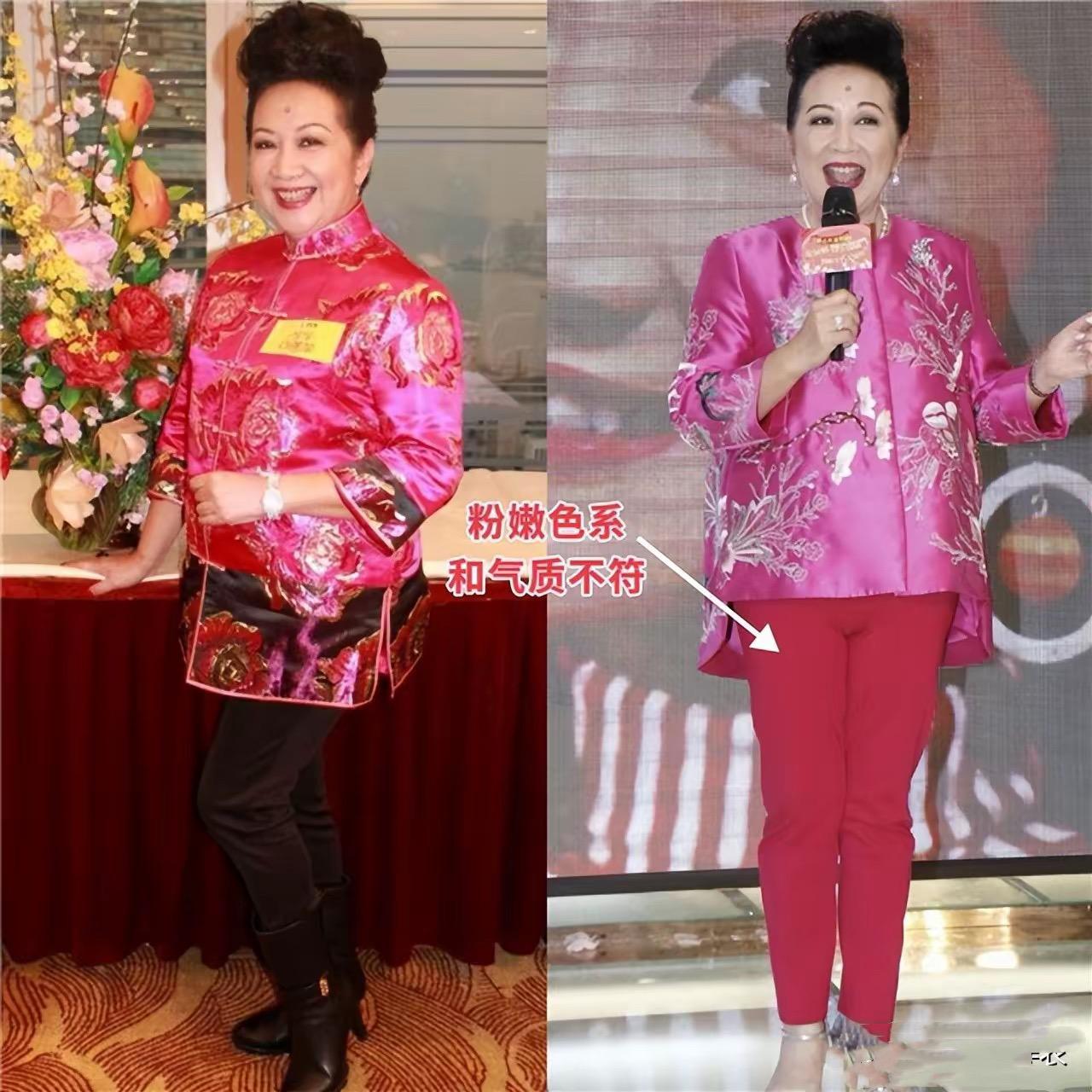 五六十歲的年紀,身材發福、體型臃腫。高亮度的粉嫩色,穿在身上特別浮誇、少了端莊與大氣。整體高級感不足、有一種很強的扮嫩嫌疑。