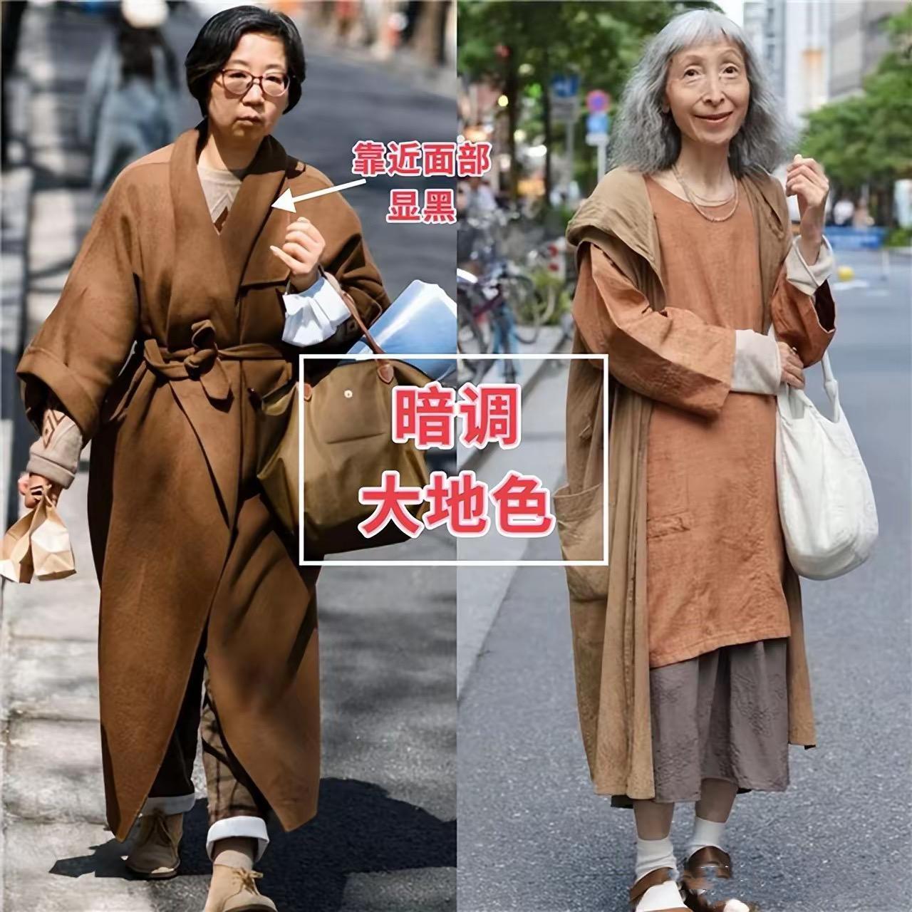 比如暗色調的大地色,就特別顯老顯黑。如果是一身秋冬色系的話,顯得整個人膚色都暗淡無光、精氣神也不夠好。