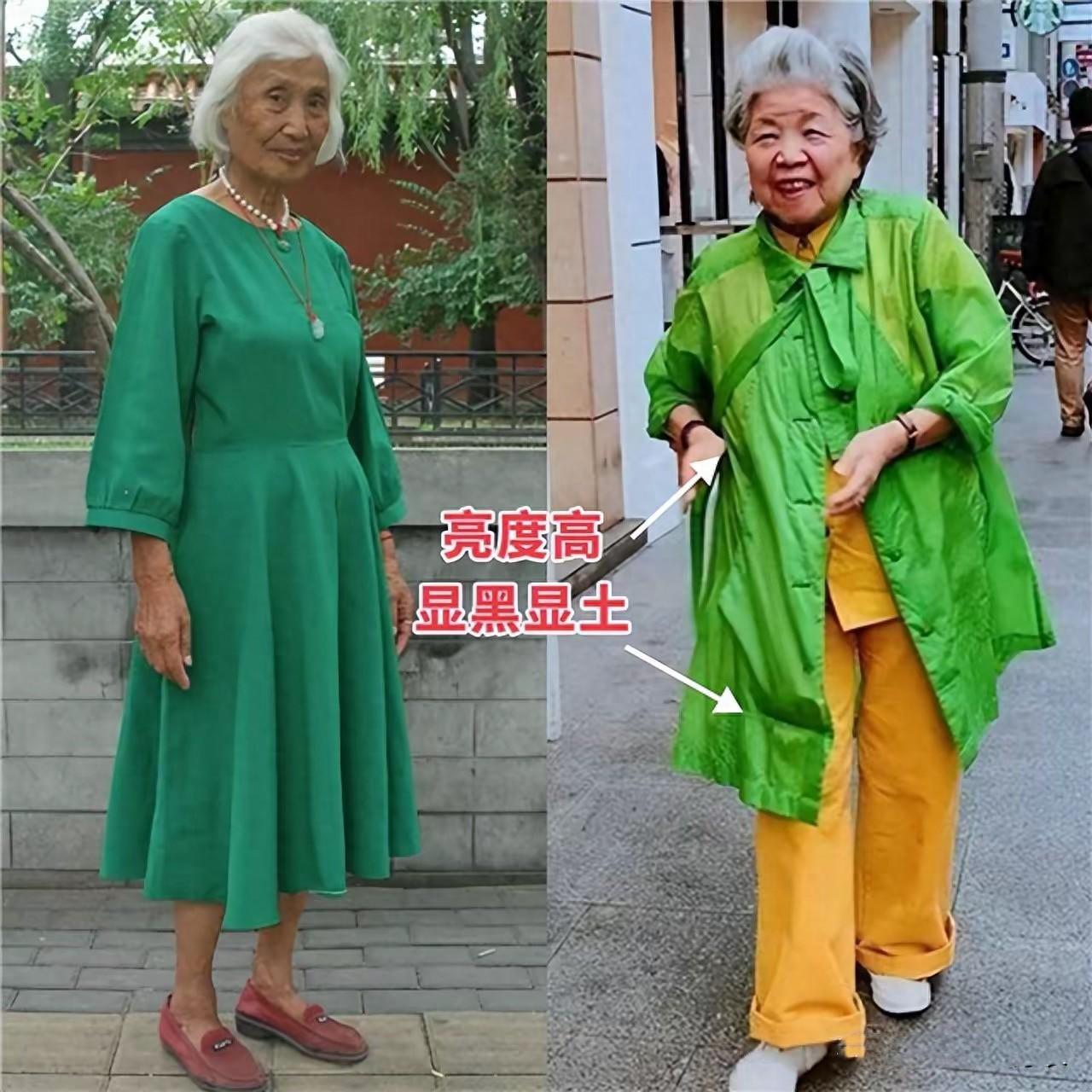 熒光色,真是太容易踩雷了。看似明亮醒目、實則土氣又顯黑。五六十歲的年紀,膚質本就不那麼完美,在高亮度熒光色的映襯下、反而顯得又黑又土氣。