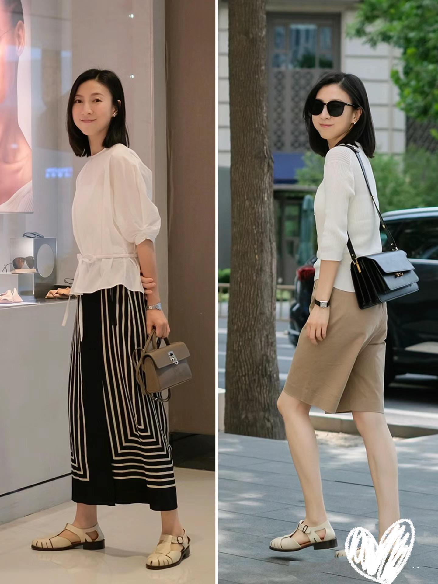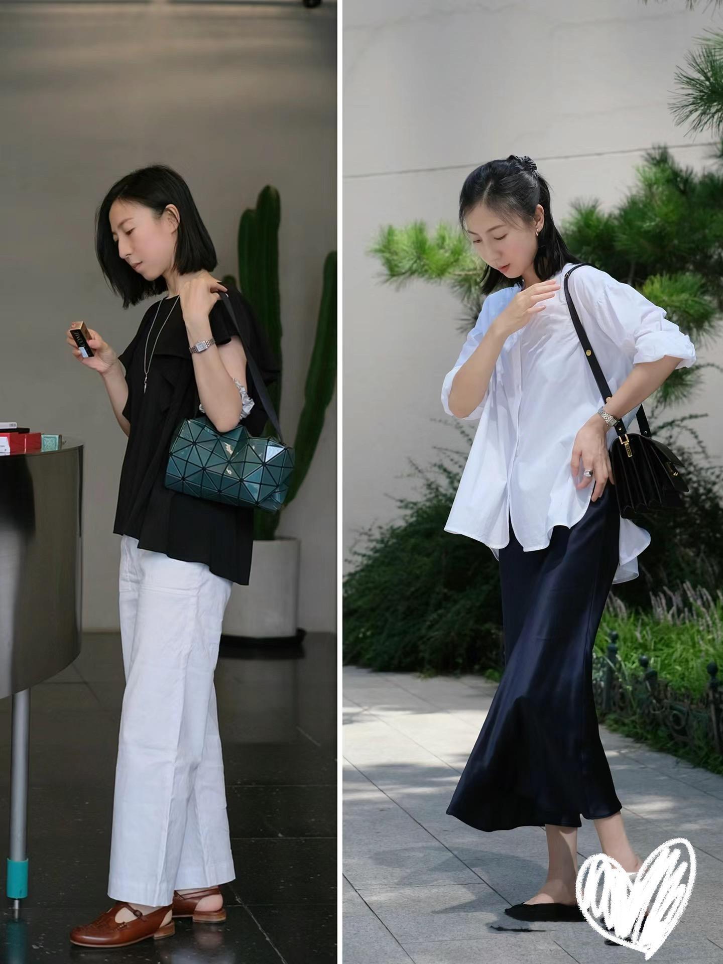比如白色襯衫、針織衫、黑色半身裙、卡其色短褲,都更加舒適百搭。用白襯衫配黑色半身裙,經典的黑白配,怎麼穿都不過時。