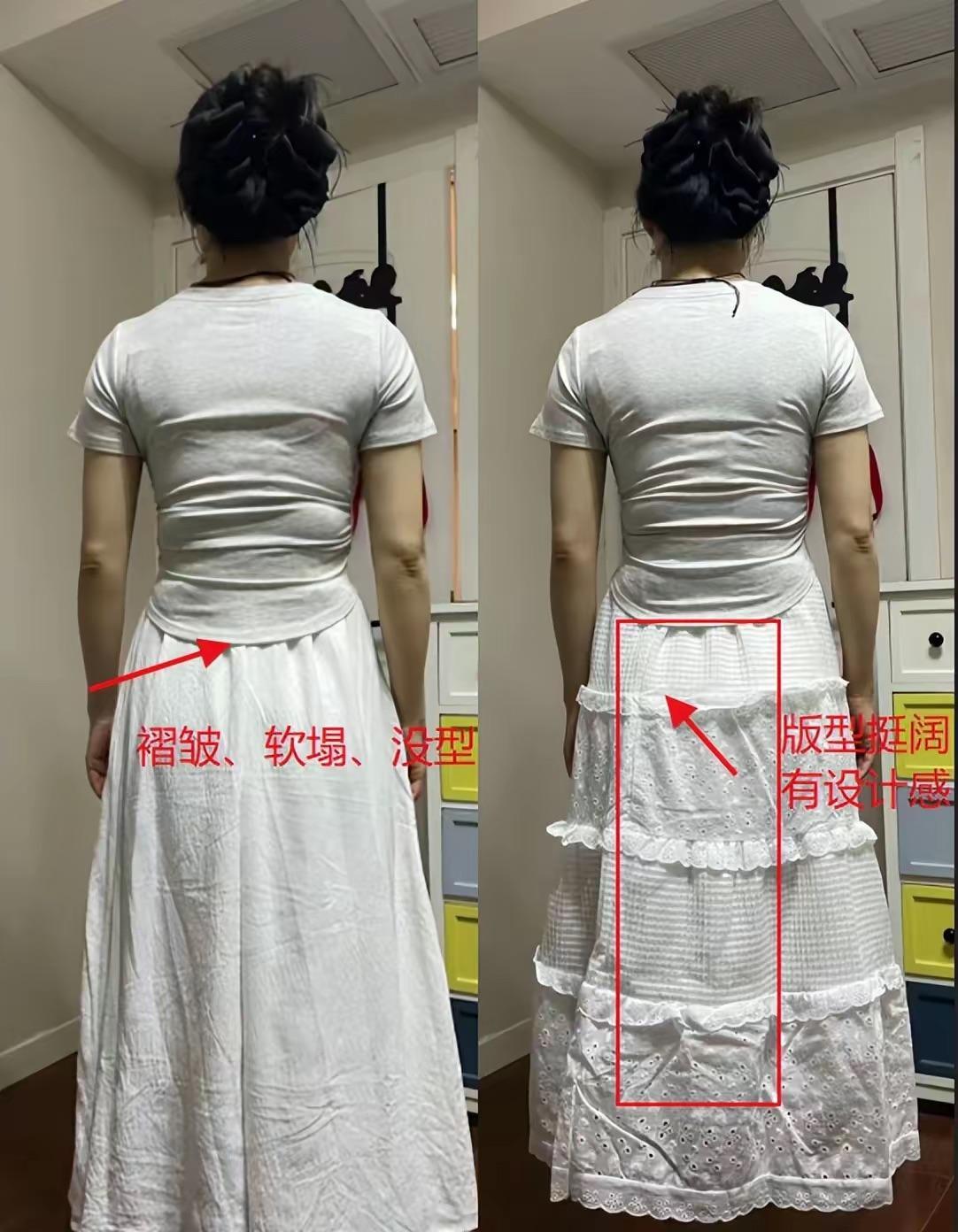 同樣是一條白色半身裙,便宜貨面料容易起褶皺、軟塌且沒有型。