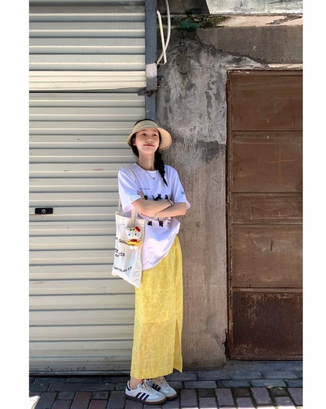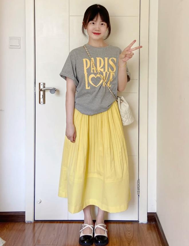 灰色字母t恤+黃色半身長裙,還配了一雙瑪麗珍單鞋,既不失休閒又乖巧的樣子,相信很多女生們都會喜歡的吧?裙子版型是a字形狀的,可藏肉顯瘦了,對於梨形身材的姐妹來說,也是非常友好的。