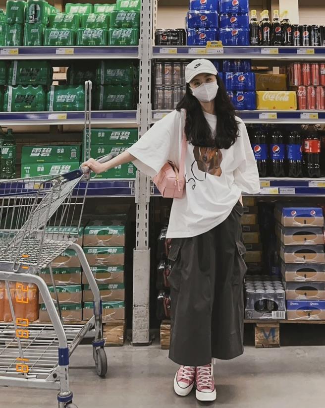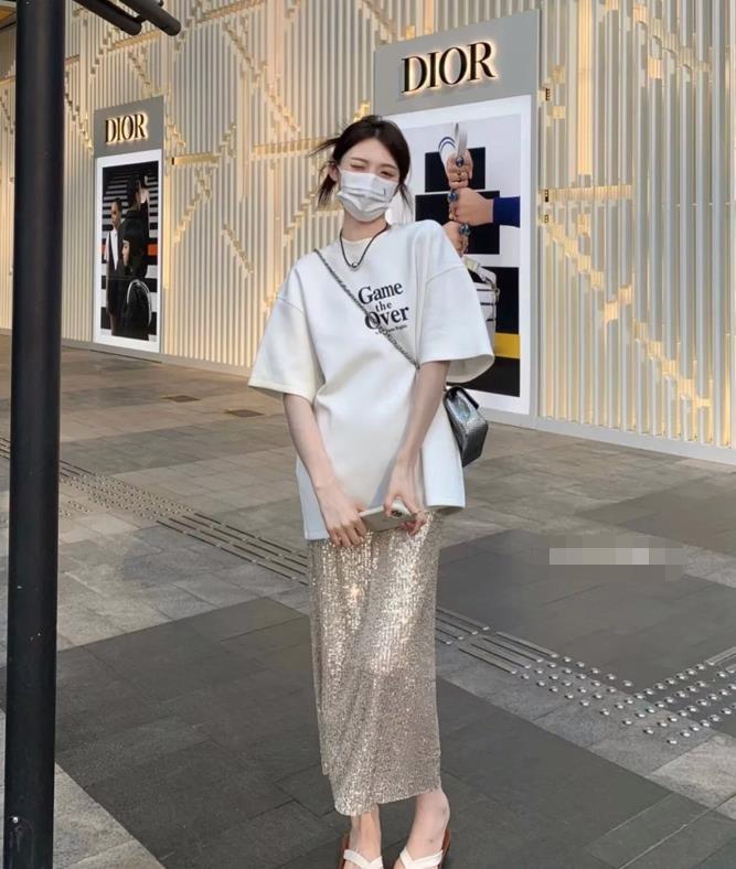 非常慵懶又隨意的一套,寬鬆的白色t恤,對於身材一點約束感都沒有,既可以讓你穿得休閒舒適,又很顯瘦。搭配灰色工裝半身長裙,又多了幾分酷颯感,輕鬆get鹽系女孩的風格。