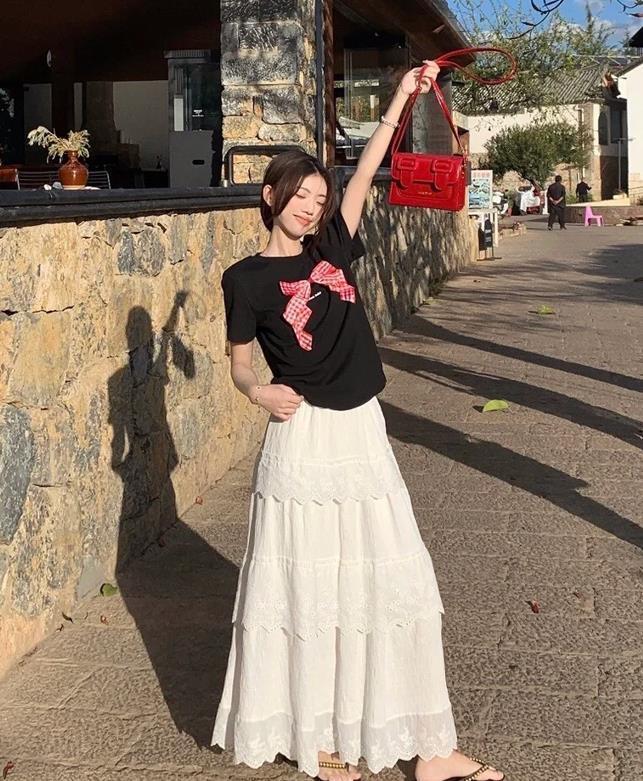 短袖配半身長裙的穿搭,夏天這樣穿一整個韓範十足,蝴蝶結的短袖t恤,細節感十足,配白色蛋糕半身長裙,也太溫柔了吧,出門隨便踩着一雙涼拖鞋,度假遊玩這麼穿,很舒適自在。