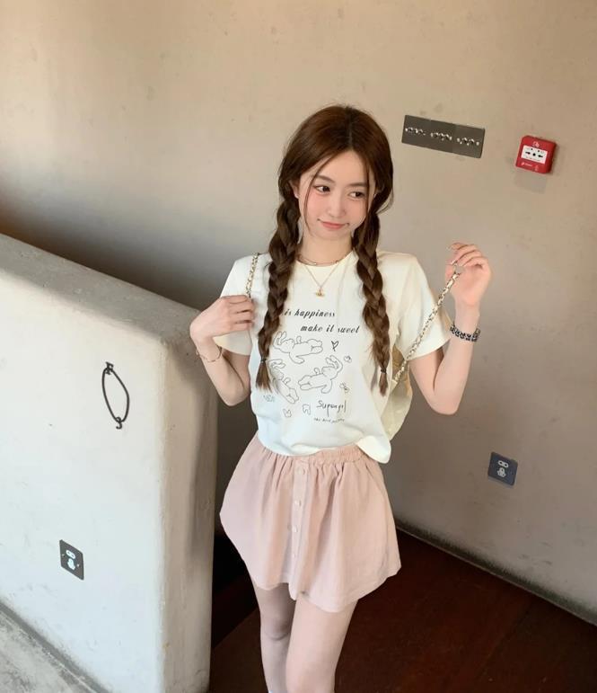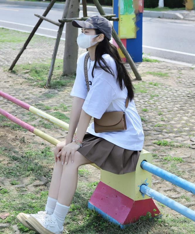夏天穿白色的t恤也太合適了,自帶清爽和乾淨的色調,搭配粉色半身短裙,一整個少女範十足,很減齡顯嫩,腳上穿着一雙白色襪子,與t恤顏色進行呼應,讓整個穿搭配色更協調了。