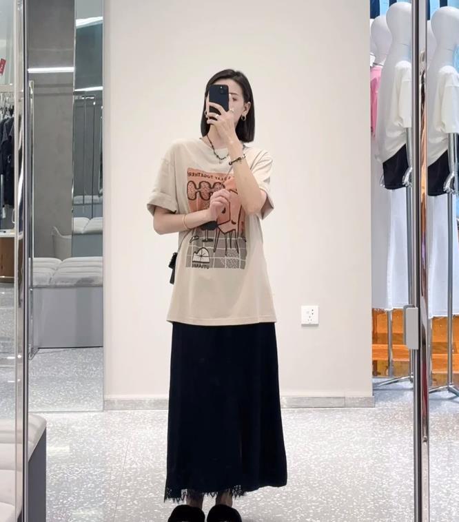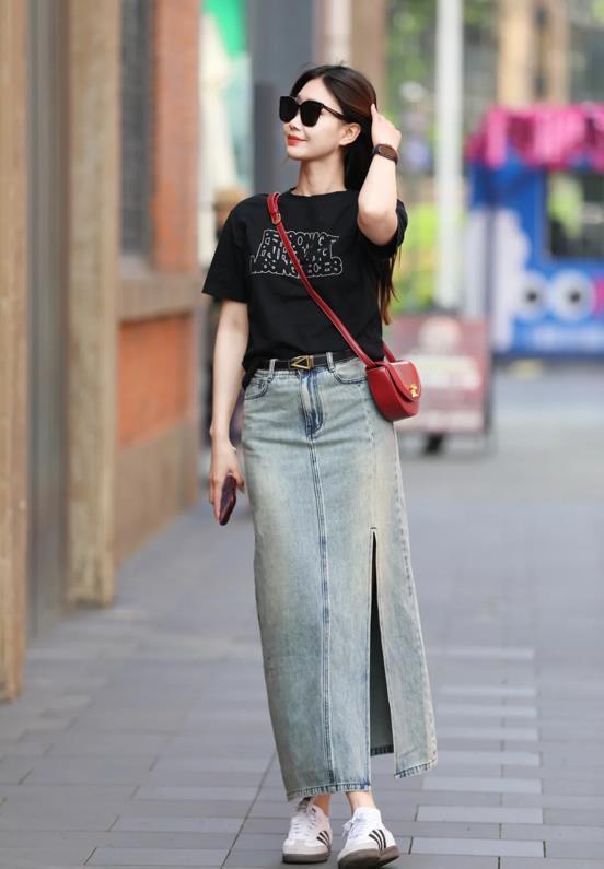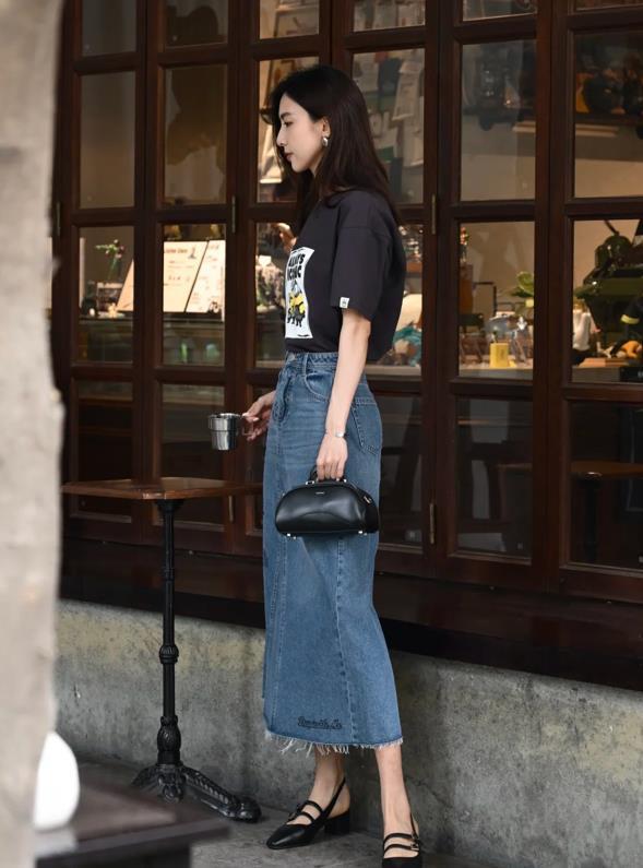 在選擇半裙和t恤的搭配時,裙子選擇長一點更能遮肉顯瘦,也可以助你打造出優雅氣質感,像牛仔半身長裙,就是比短裙更具有遮掩修飾的效果。