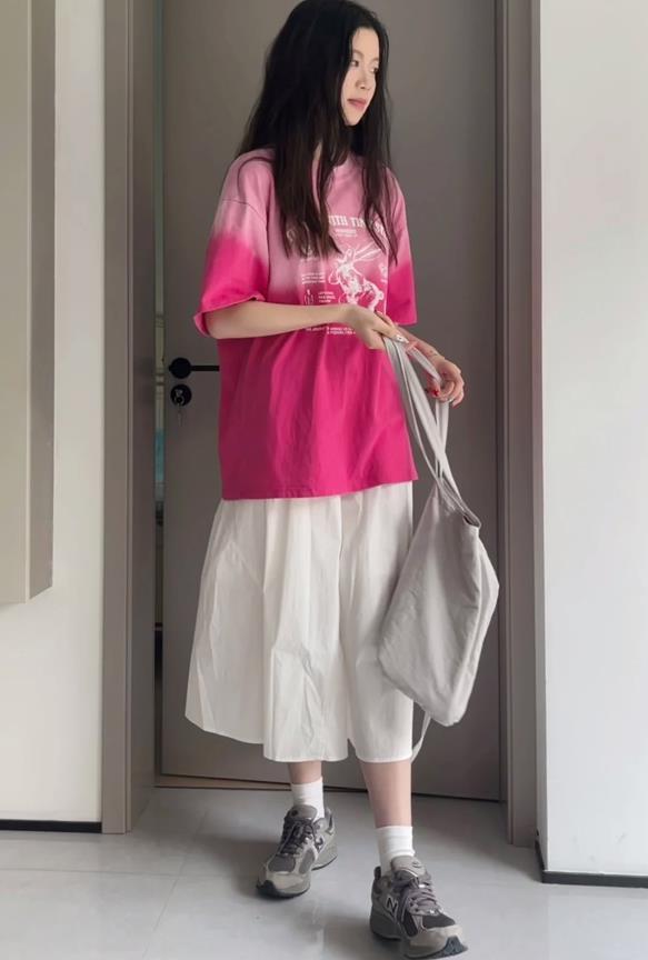 無法拒絕的一套夏日穿搭,白色半身長裙,自帶仙氣感,還藏肉顯瘦,搭配同樣寬鬆的T恤,這麼一身看起來就很自在隨性,再配上一雙運動鞋,超舒適的。