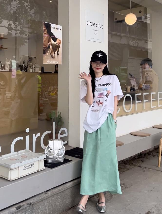 很可愛又充滿趣味性的白色t恤,寬鬆的版型,真的太顯瘦和藏肉了,選擇一條綠色的半身長裙來配,這個顏色我實在是太喜歡了,可以讓人眼前一亮的感覺。直筒的裙身,任何一種身材都能輕鬆hold住。
