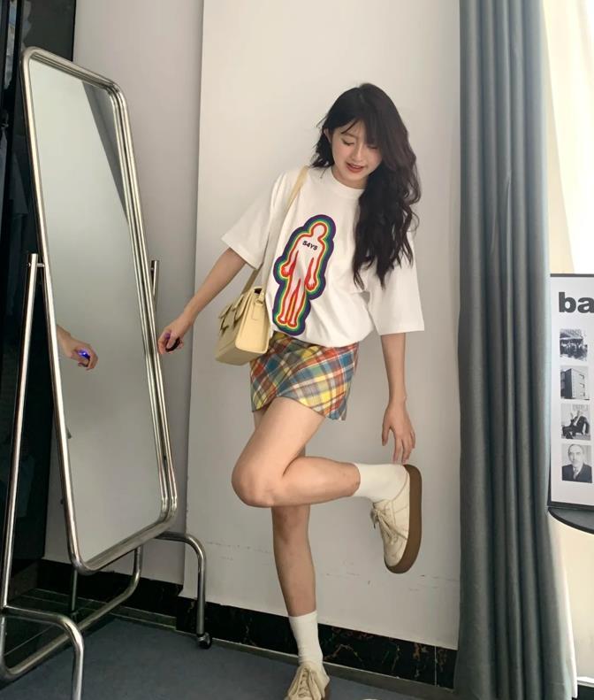 一簡一繁的搭配,就是不管在哪一種風格的穿搭裏,都是很合適的,白色t恤,版型記得選擇寬鬆一些,更藏肉顯瘦和舒適。搭配格子半身短裙,不僅顯腿長,還能打造出高挑感。