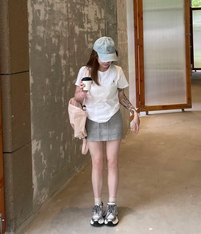這套蘋果型身材也很合適的穿搭,白色t恤,基礎簡約款,真的超級百搭的,與各種下裝都可以很好搭配一起,選擇灰色半身短裙+運動鞋,既不失休閒,又很青春活力。