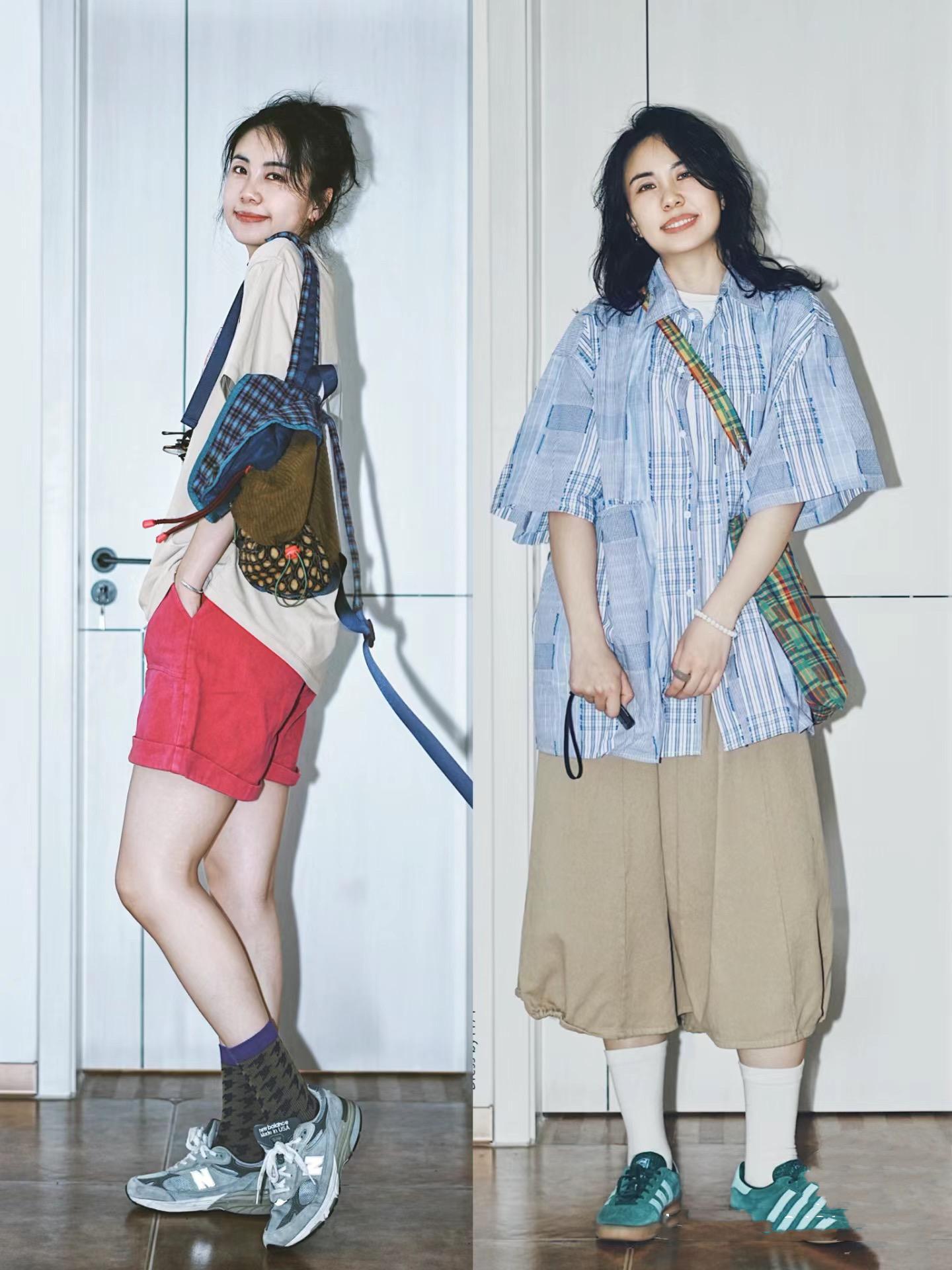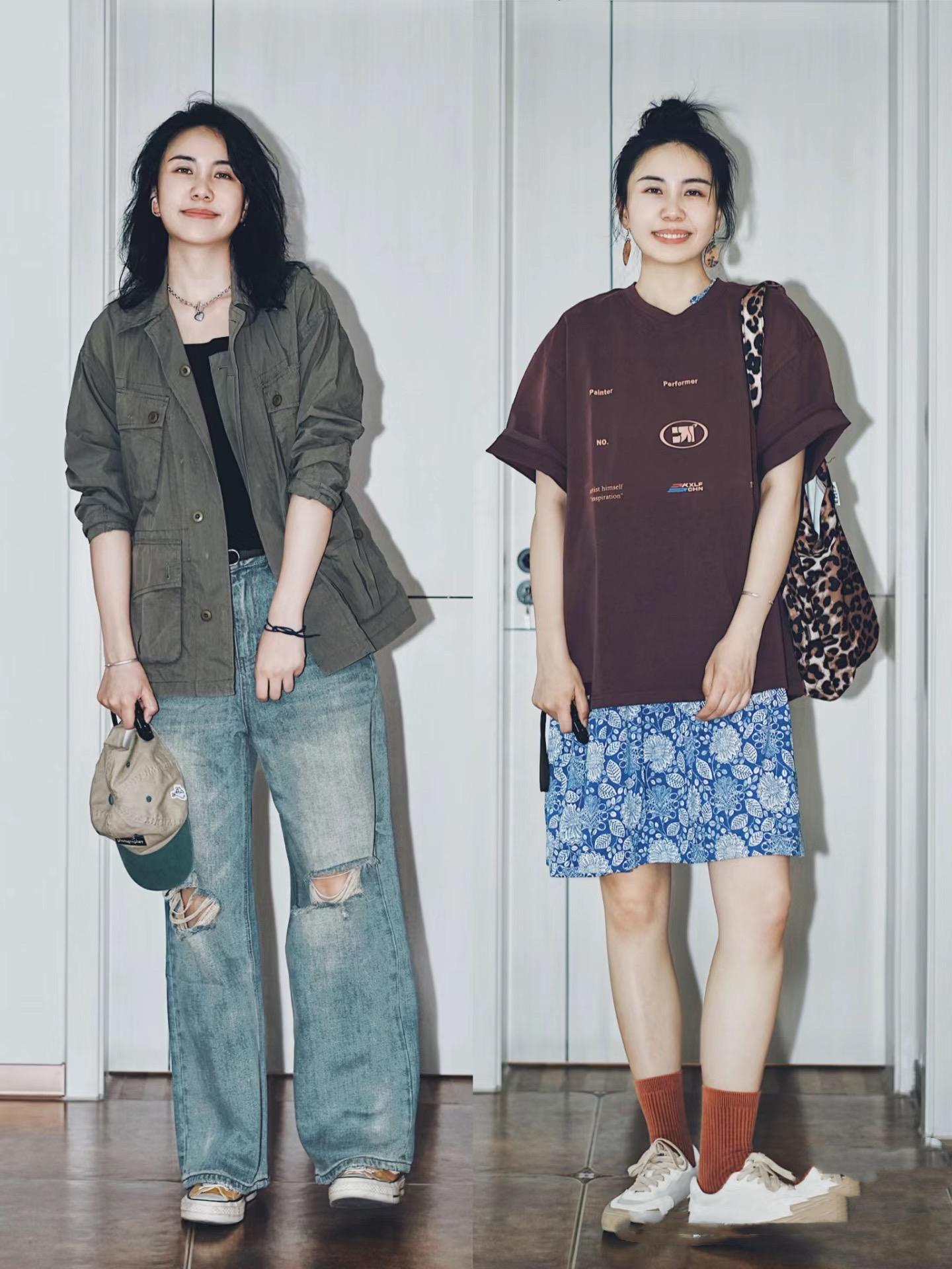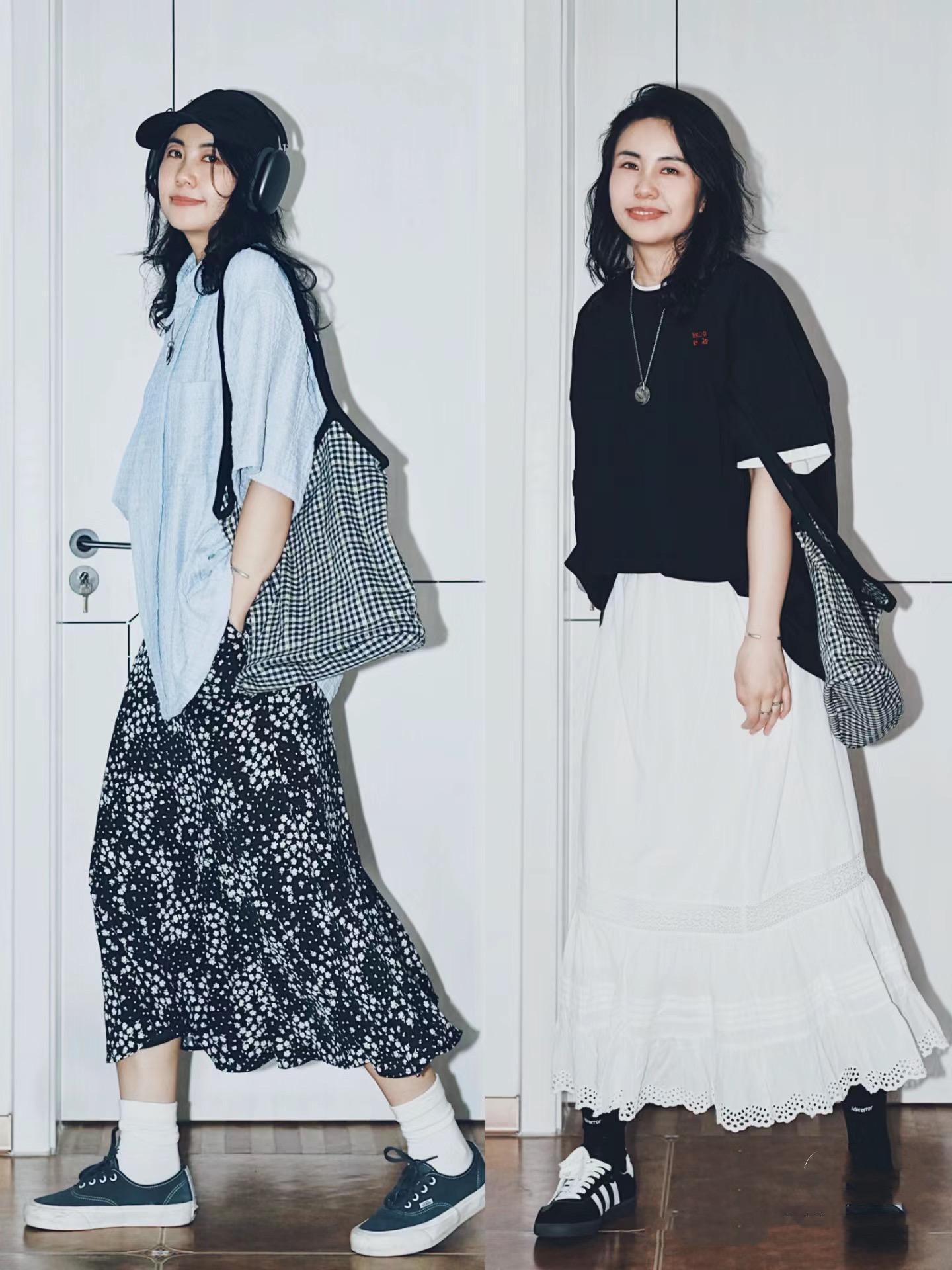 淺藍色的襯衫,可以選擇長袖款、也可以搭配短袖款。寬鬆一點的淺藍色襯衫,包容性更強、也容易塑造出紙片身材,配波點印花半身裙,清新減齡。