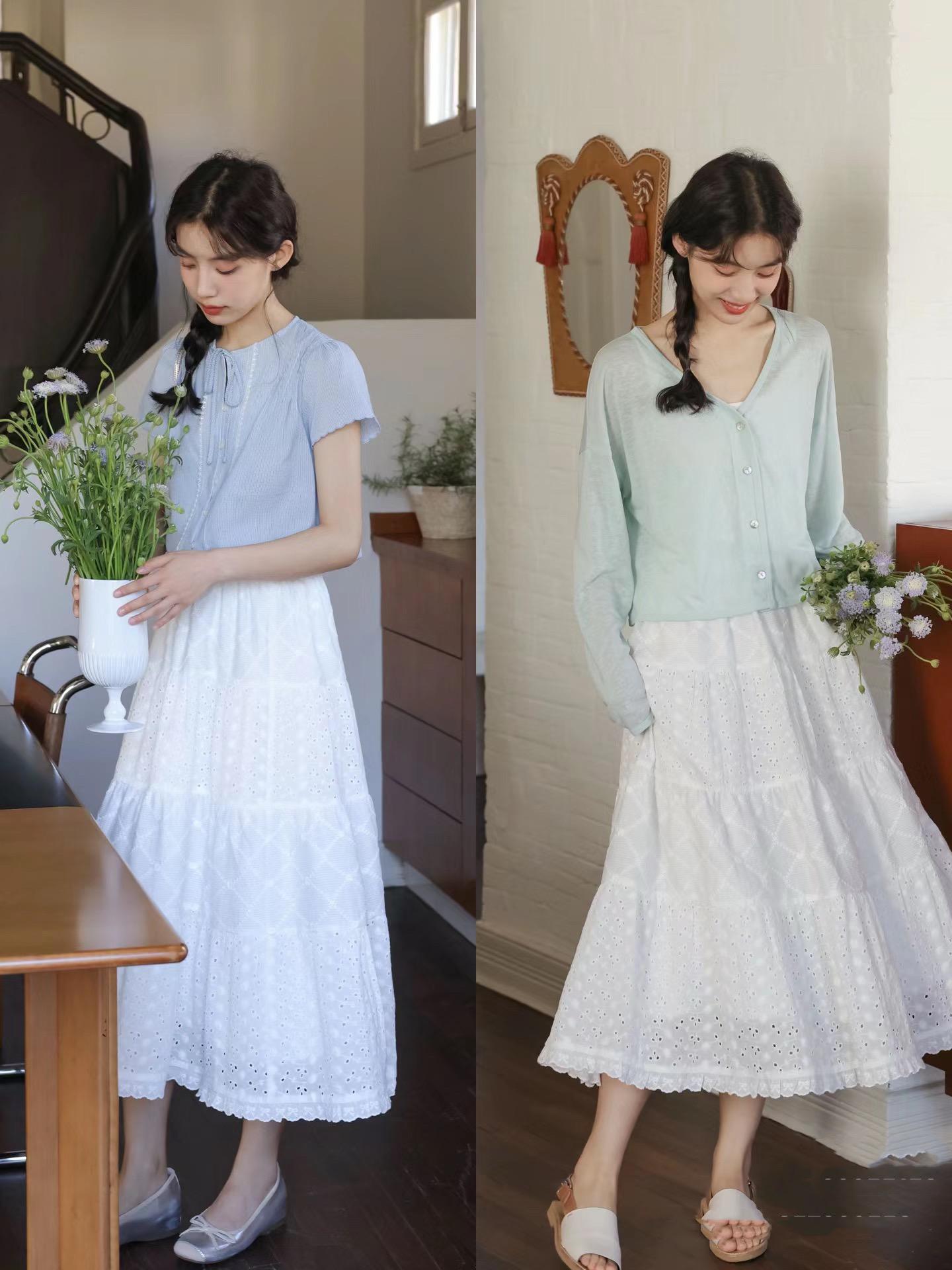 淺綠色的V領罩衫,配上白色蕾絲吊帶裙,有一種清新甜美、文藝減齡的效果。淺色系的服裝,更加顯白、也透着夏日的冰涼與清新。