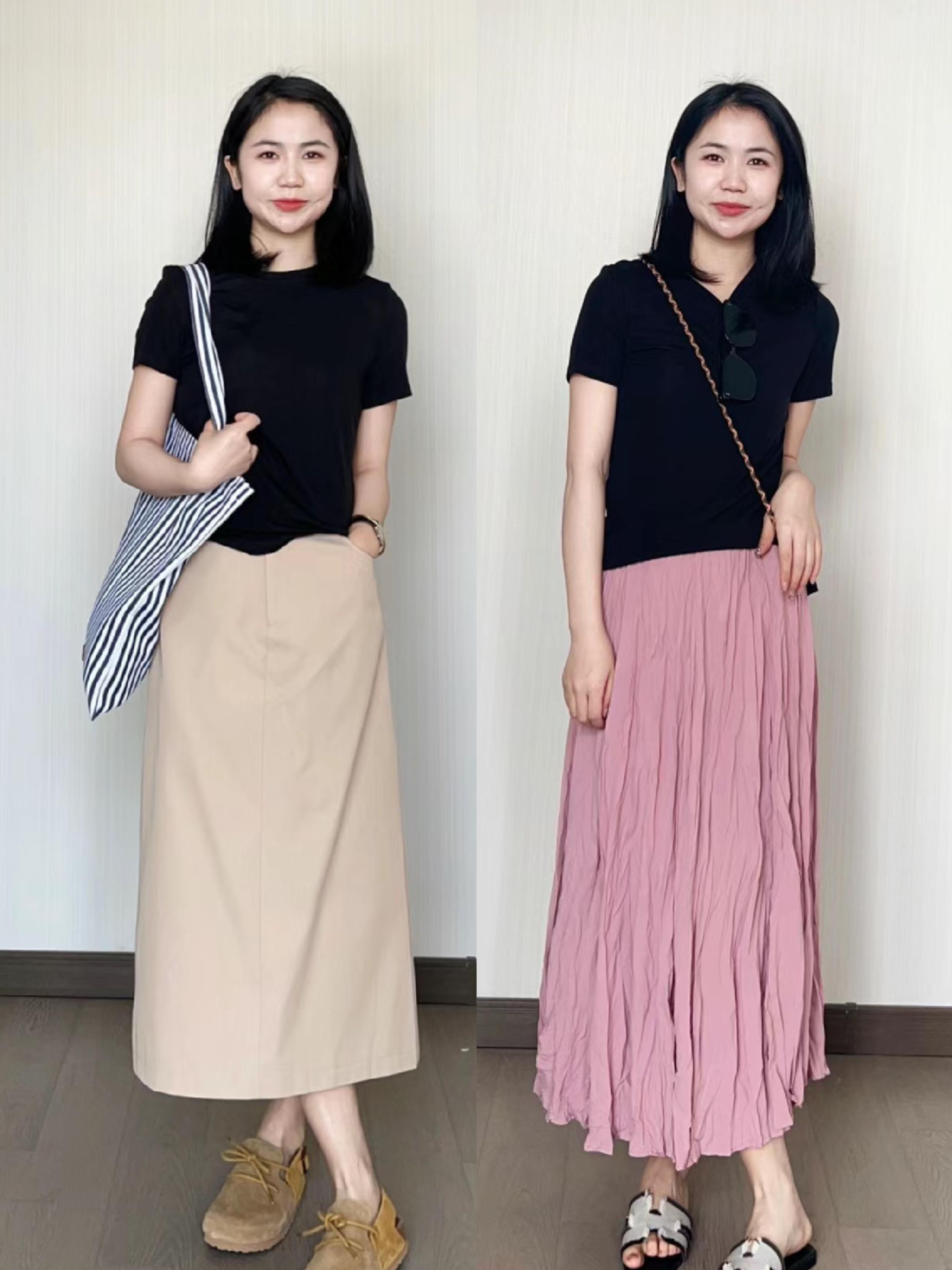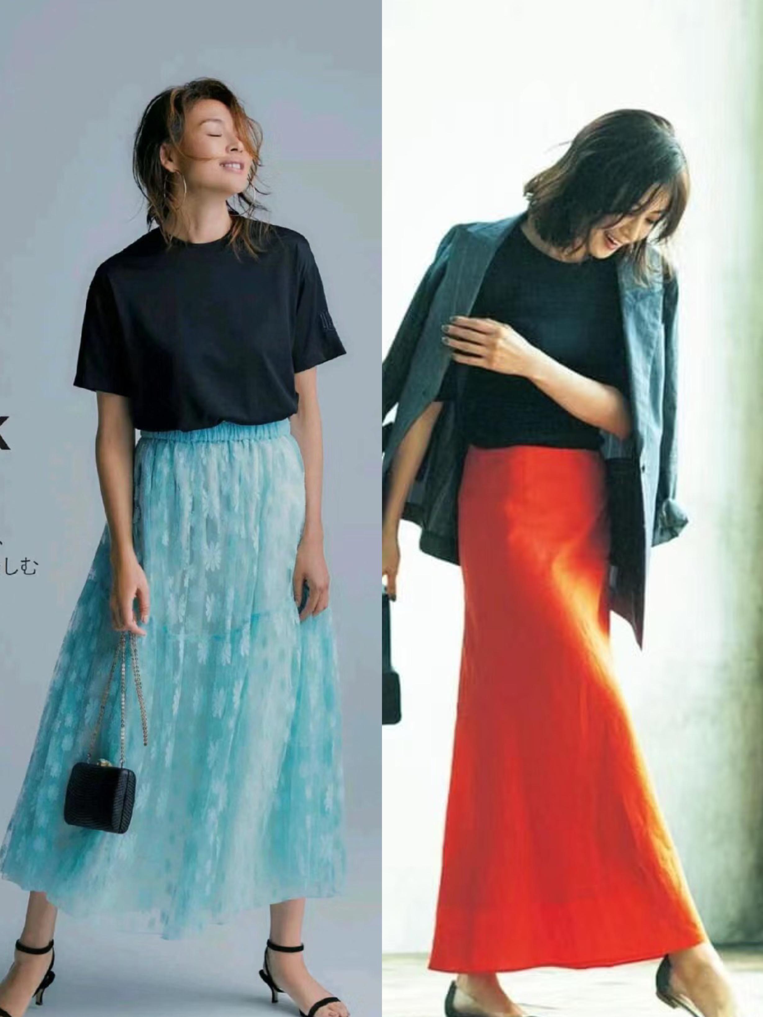 我們穿稍微寬鬆且基礎的黑色T恤,可以搭配色彩明快的半身裙。高亮度的半身裙,帶來更豐富、驚豔的穿搭氛圍,弱化年齡感、也更加洋氣。
