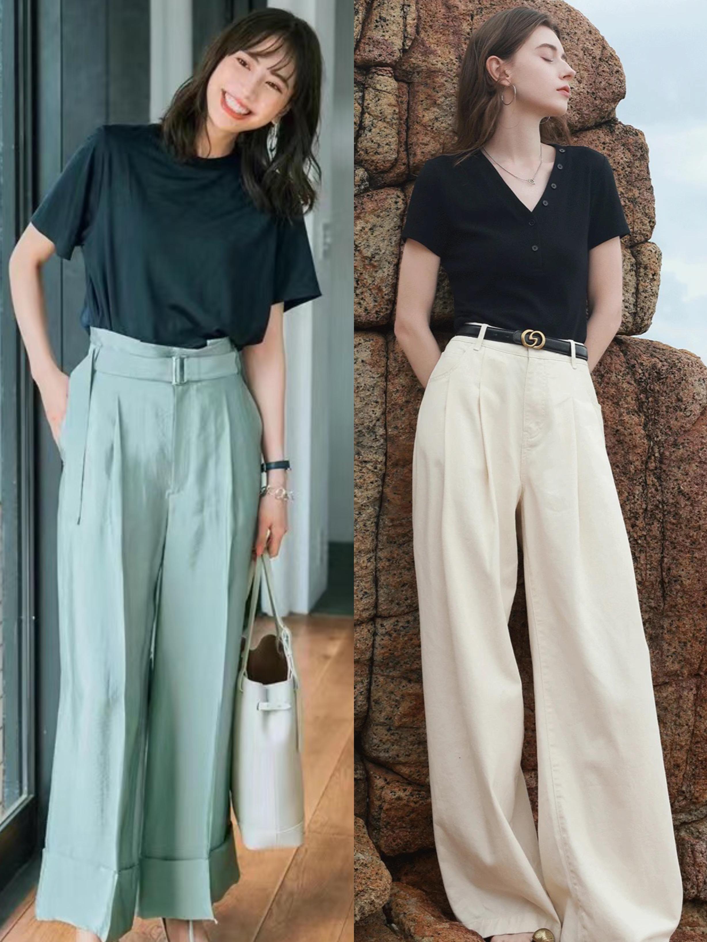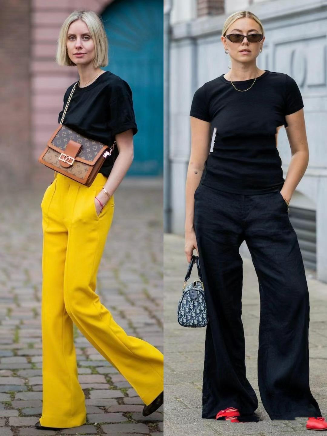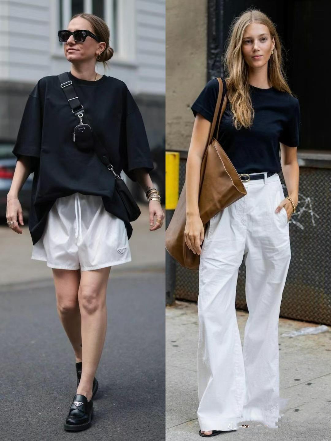 黑色T恤配白色短褲、或者白色闊腿褲,都更加清爽惹眼一些。黑色T恤+白色高腰闊腿褲,搭黑色腰帶,精緻考究、簡約高級、氣場更強。