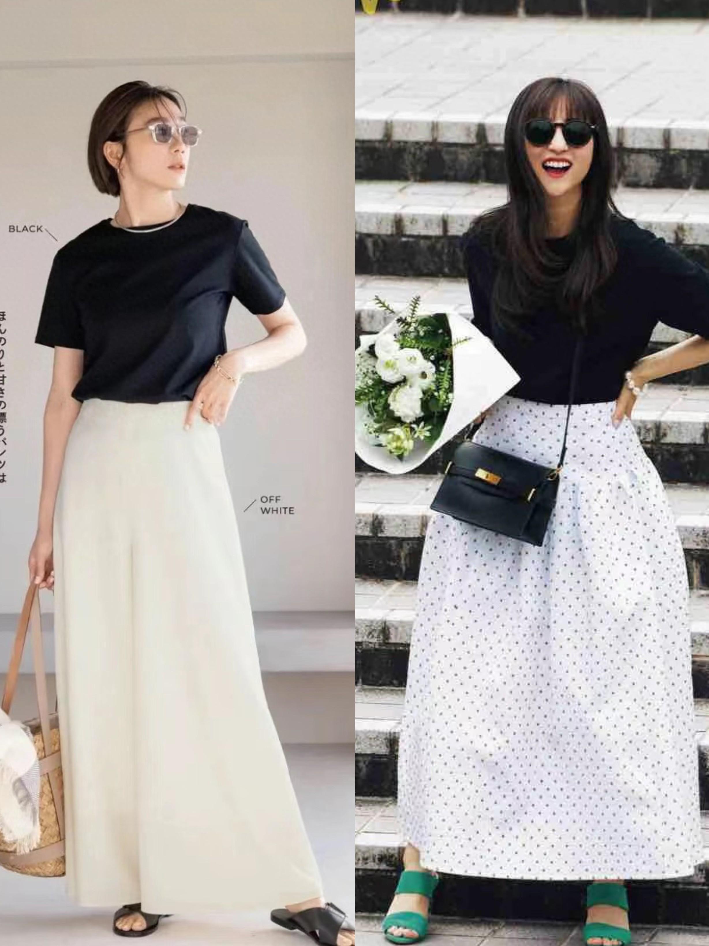 經典的黑白配,永遠不會過時。如果擔心膚色不夠白皙、大面積的亮色不敢放在上半身。我們可以嘗試將白色放在下半身。