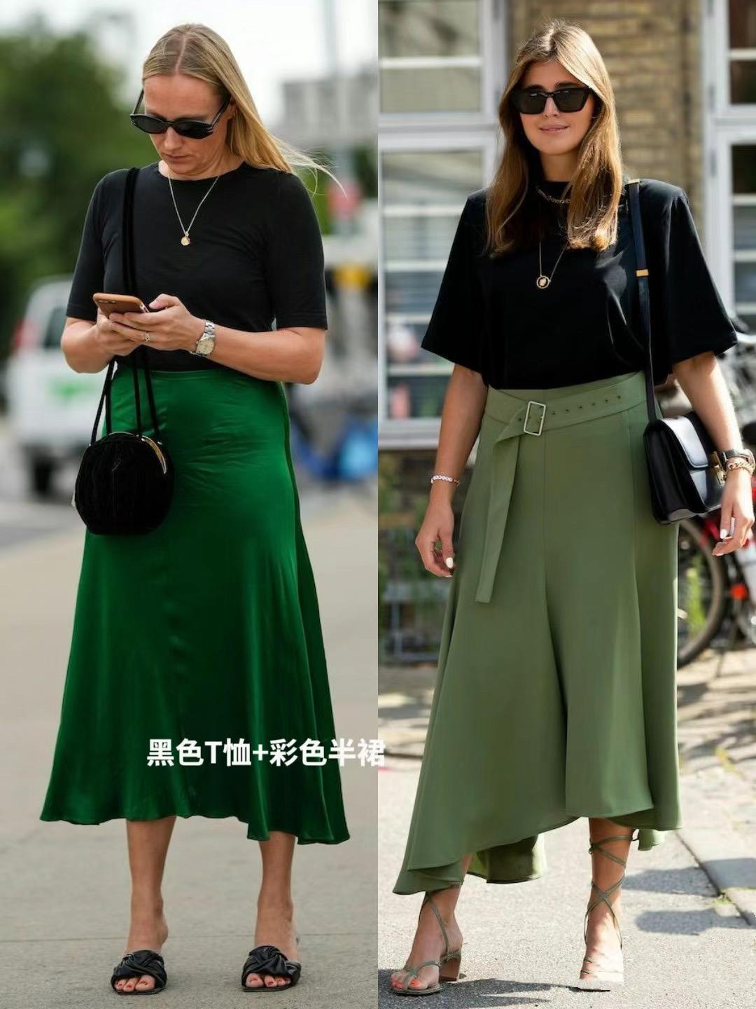 黑色T恤+綠色半身裙,也是一種高級耐看的配色。同屬於高飽和度的色彩,搭配起來也更爲端莊。寬鬆的黑色T恤,搭配裙襬的飄逸剪裁,隨性又不失女人味。
