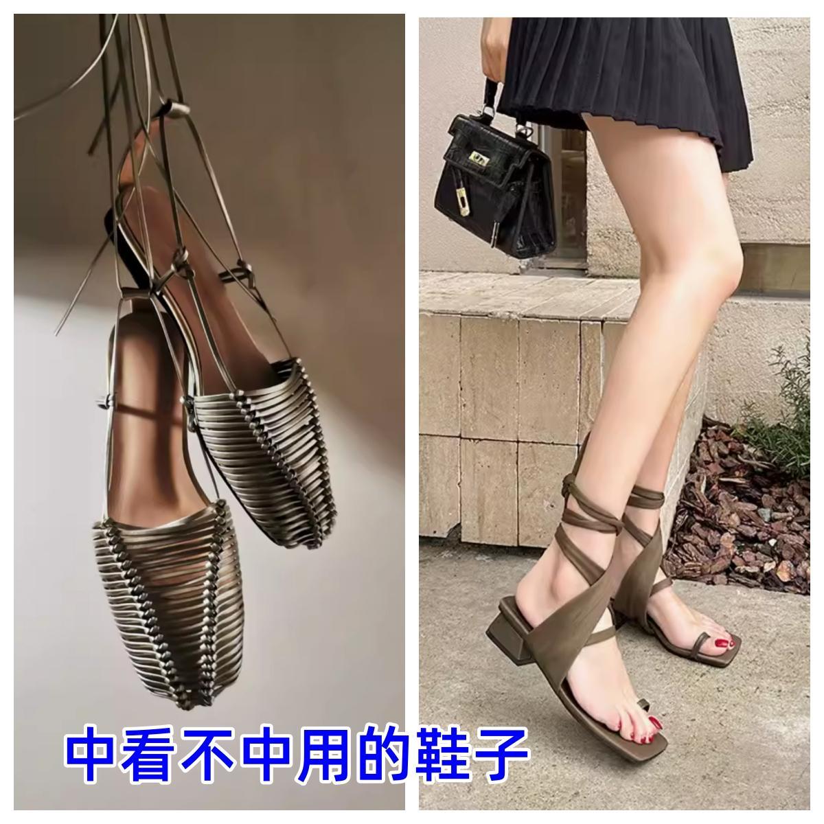 除了羅馬鞋外,還有這種綁帶設計的,也是層層繞繞的感覺,腿短的人千萬別穿啊。綁帶涼鞋呢,綁的松走兩步就掉了,綁的姐小腿肉勒的跟豬蹄兒似的。重點就是顯腿短顯腿短。