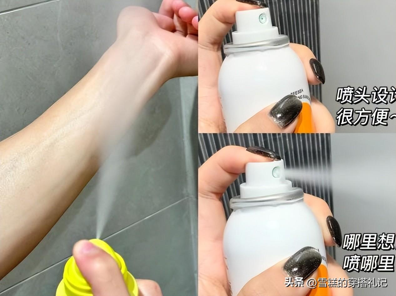 大家在塗防曬的時候千萬不要忘記脖子、手臂、大腿等其他暴露在外面的皮膚,可以選擇一款細膩一些的防曬噴霧從頭到腳多噴幾下,形成一個全面的保護膜減少紫外線對皮膚的傷害,記得儘量選擇噴頭細膩的款式,用手輕輕按摩拍打幾下,然後等待三分鐘成膜後再出門。